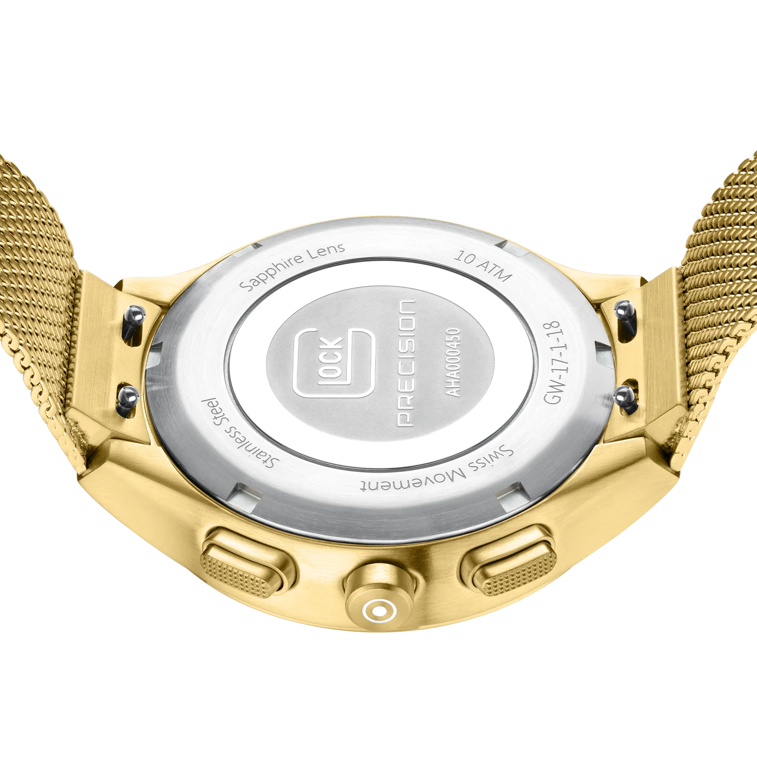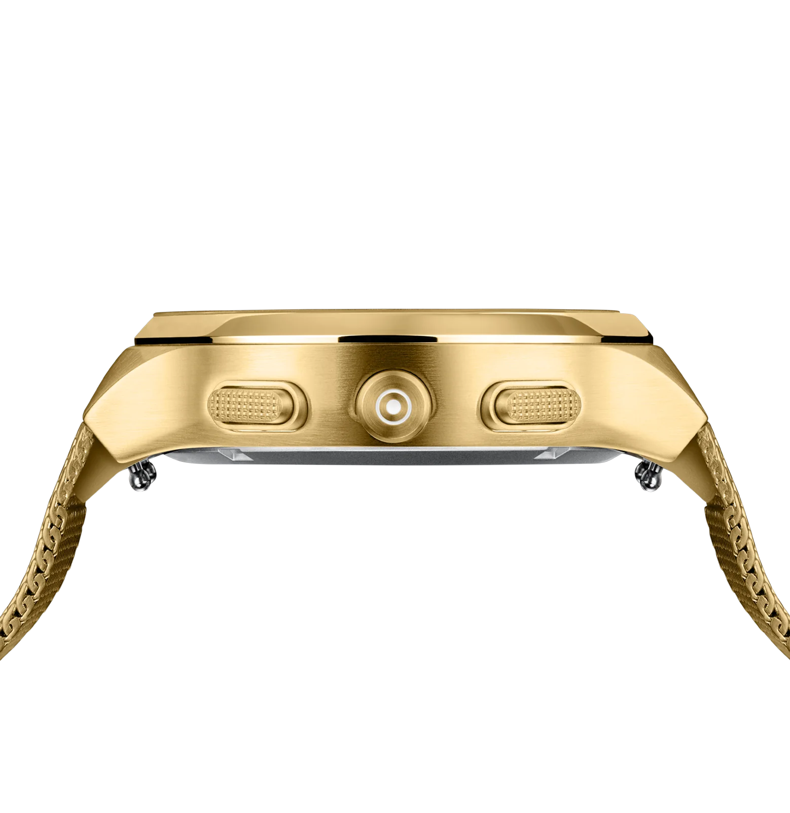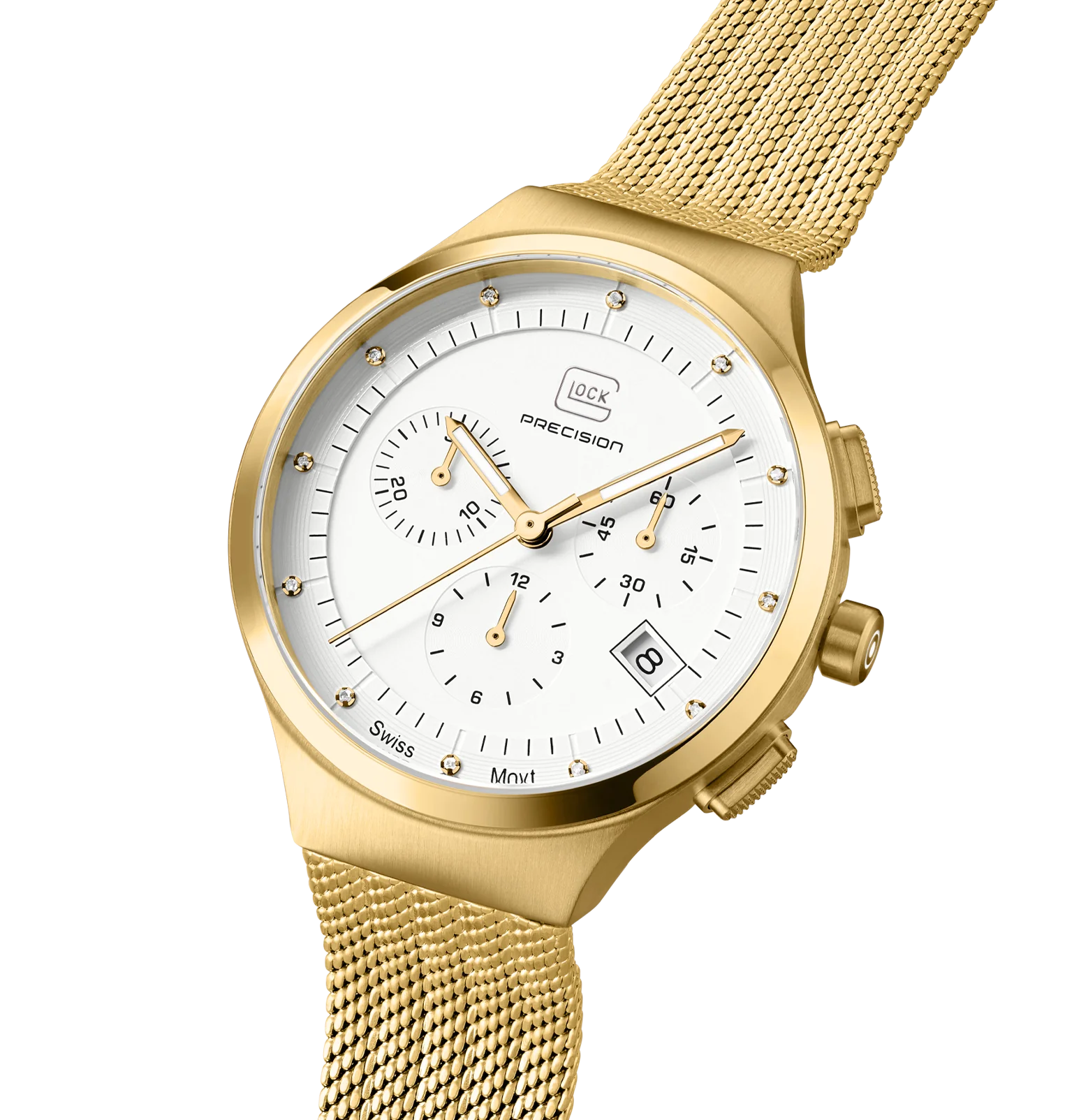 The rose gold-tone stainless steel case encloses the dial, which is adorned with twelve diamonds and features hands with Swiss Super-LumiNova®. The gunmetal mesh strap provides a comfortable and secure fit. Driven by a Swiss movement, equipped with a practical chronograph function, and featuring a 10 ATM water-resistance rating, this watch blends form and function.