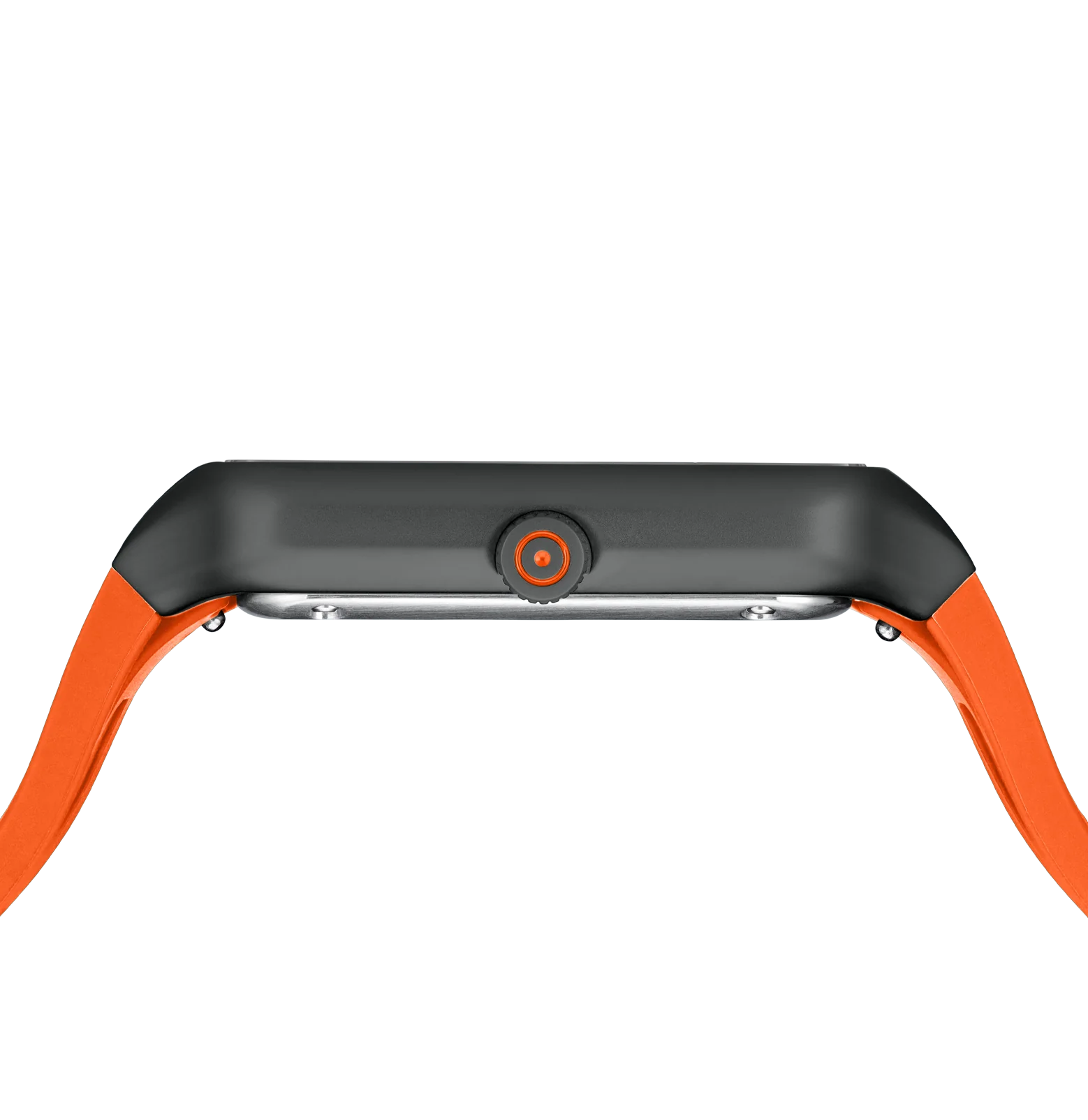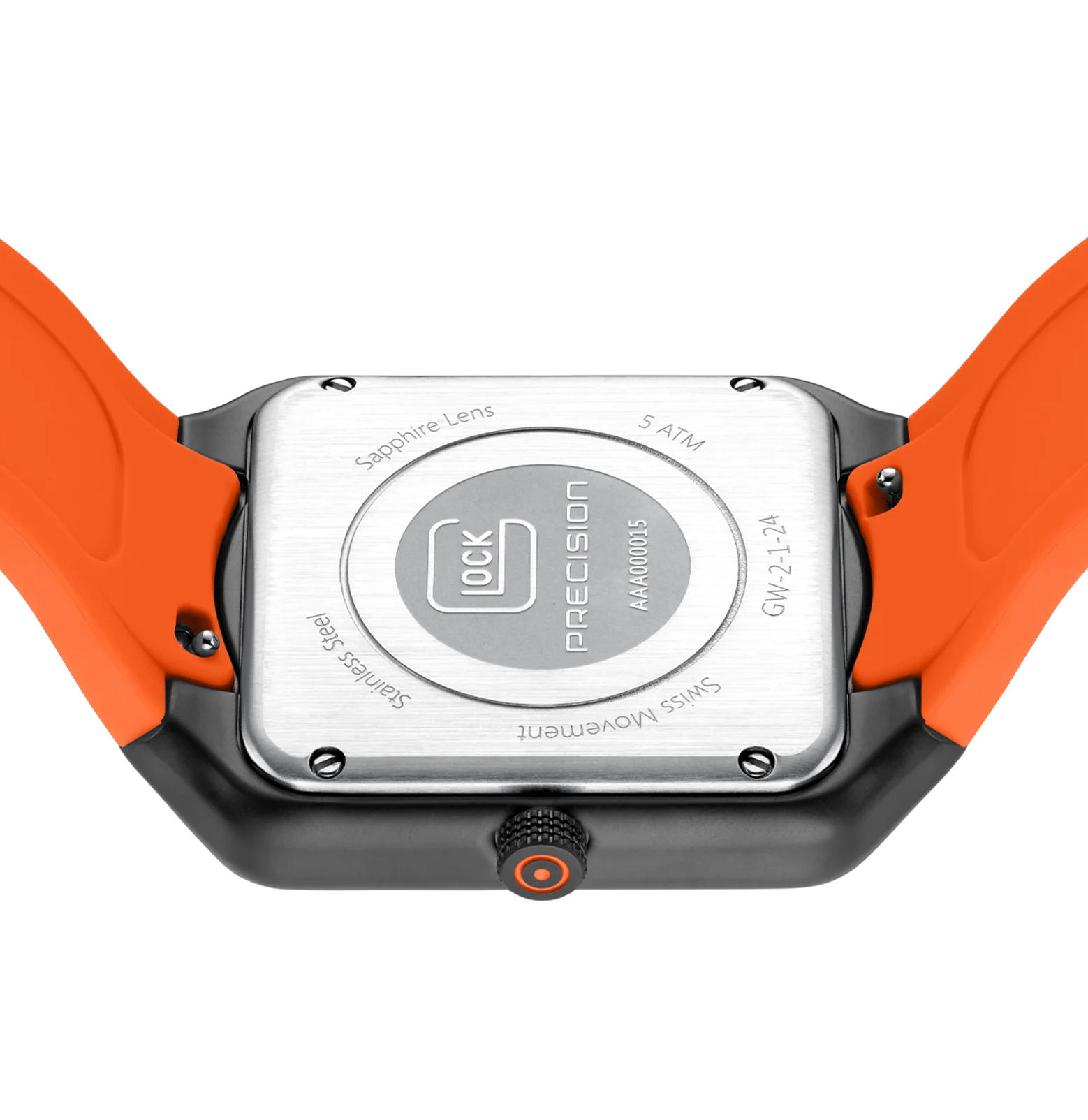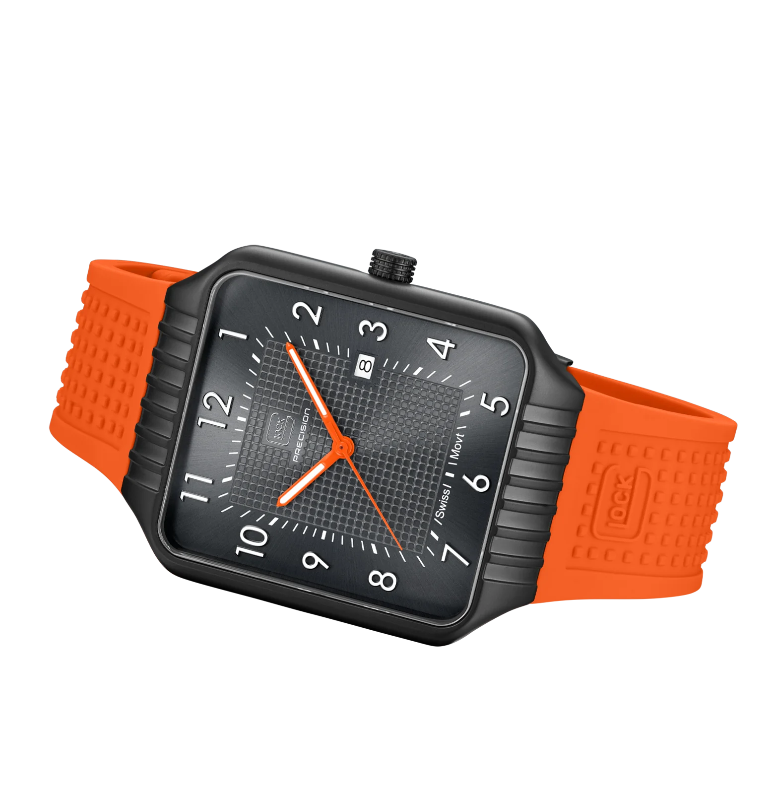 Encased in gunmetal-finish stainless steel and protected by scratch-resistant sapphire crystal, this watch offers clarity and durability. Its square dial showcases hands and indices with Swiss Super-LumiNova® in vibrant orange. The matching-color silicone strap features GLOCK's RTF texture, ensuring a comfortable fit. With a 5 ATM water-resistance rating and a precise Swiss movement, it is the epitome of reliability.