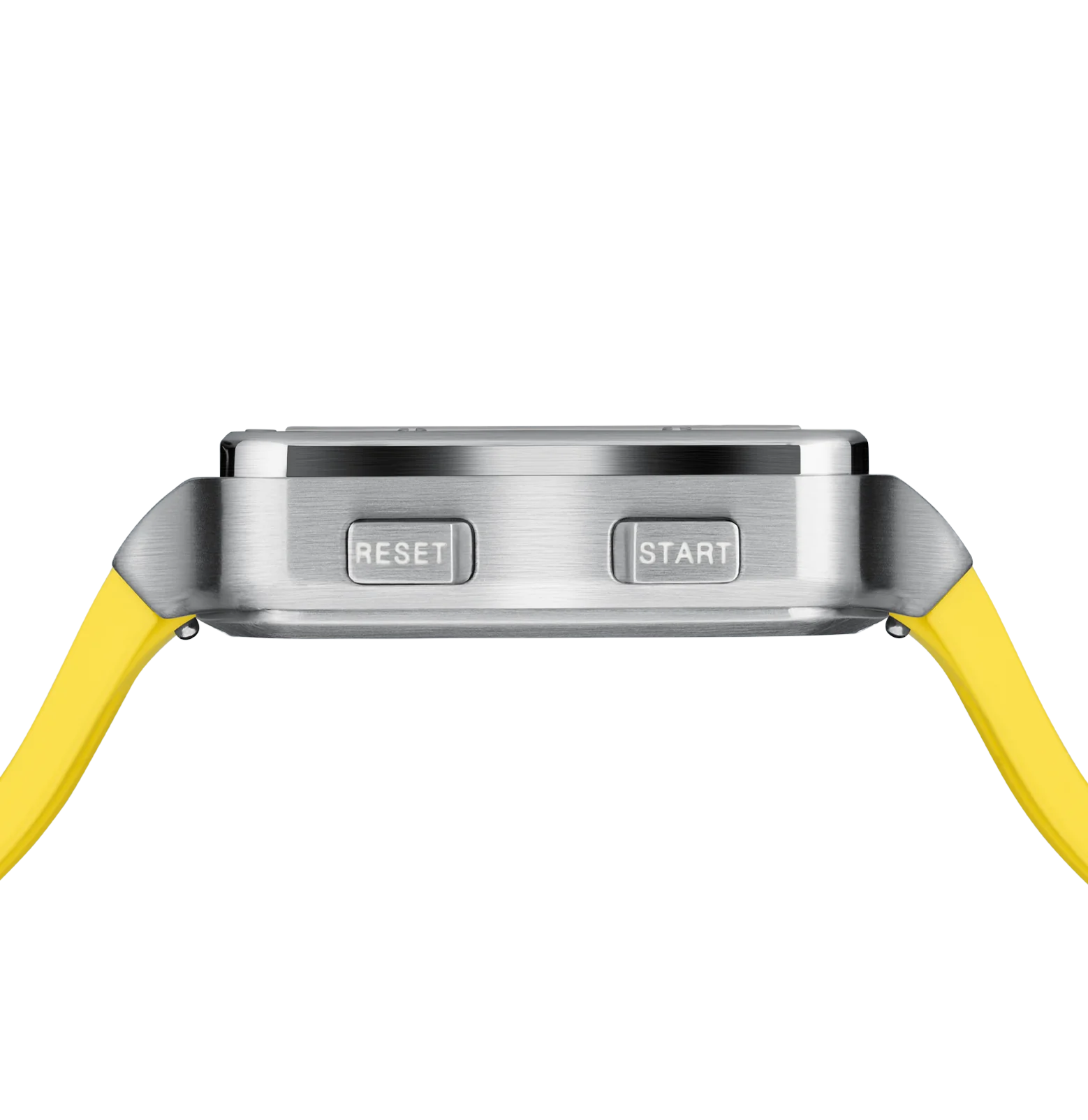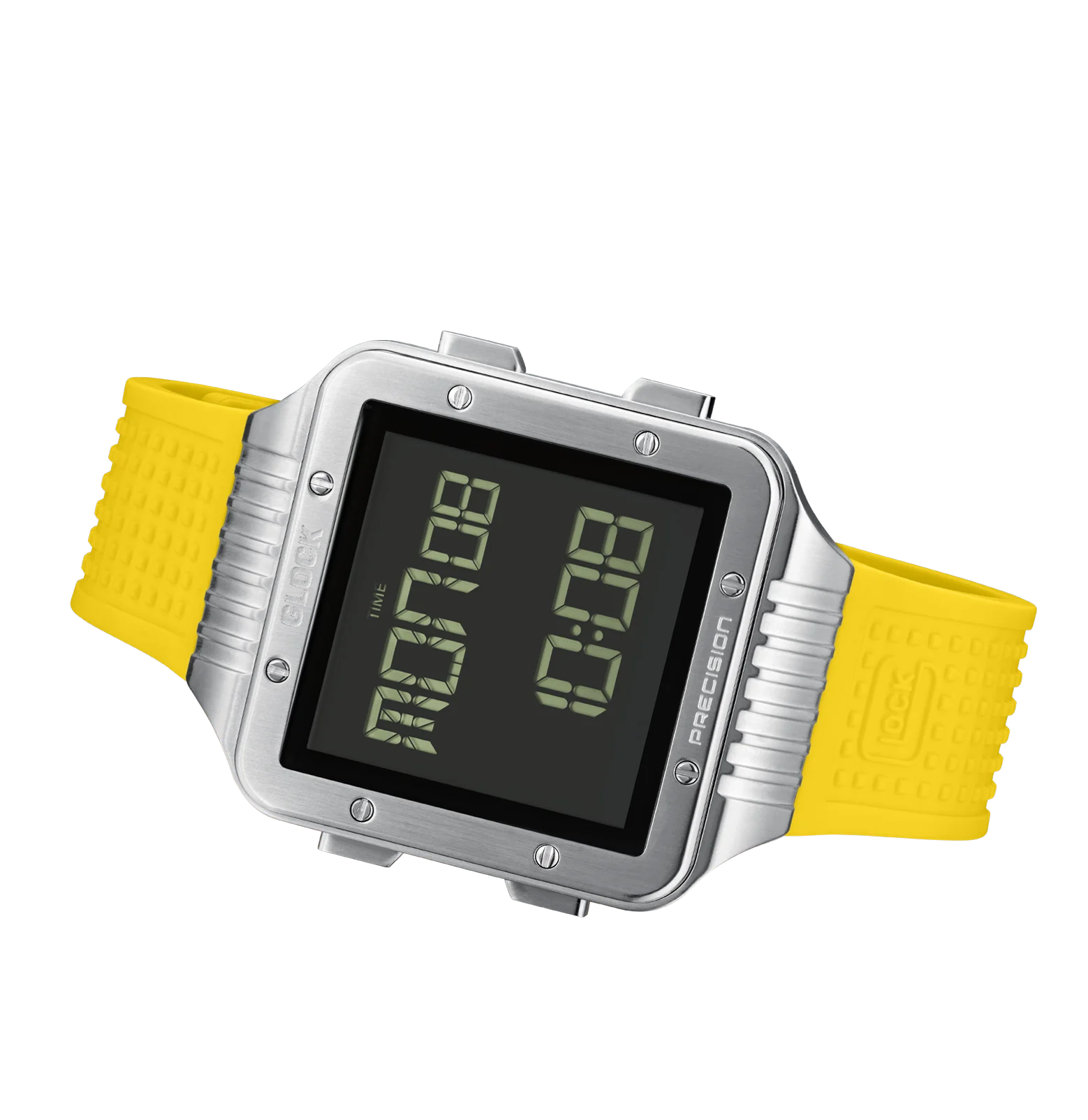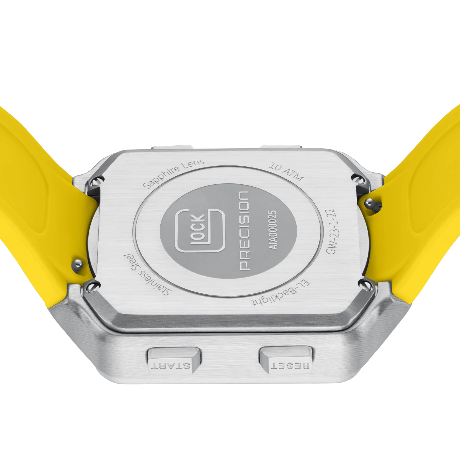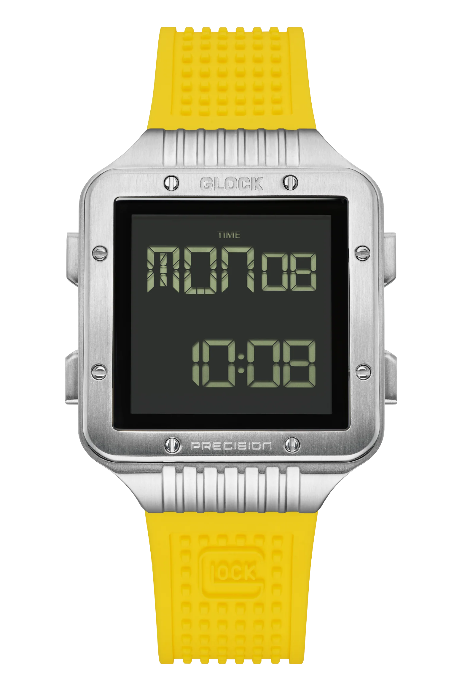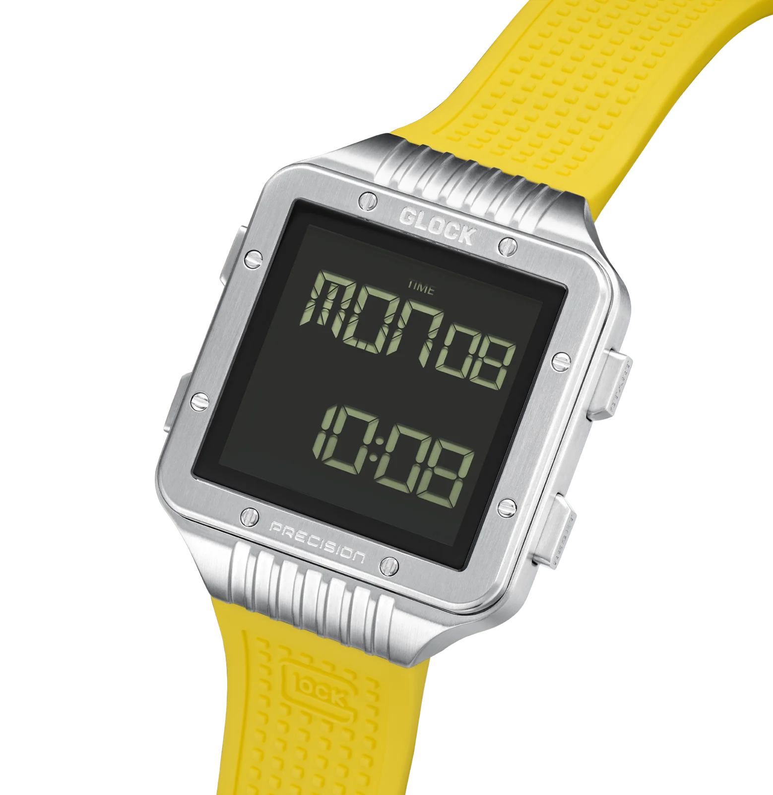 This digital watch features a square stainless steel case surrounding a digital display against a black backdrop. The yellow silicone strap with GLOCK's RTF texture strikes a balance between comfort and a sporty aesthetic. With a sapphire crystal, a chronograph function, and a 10 ATM water-resistance rating, it stands out with its array of technical features.