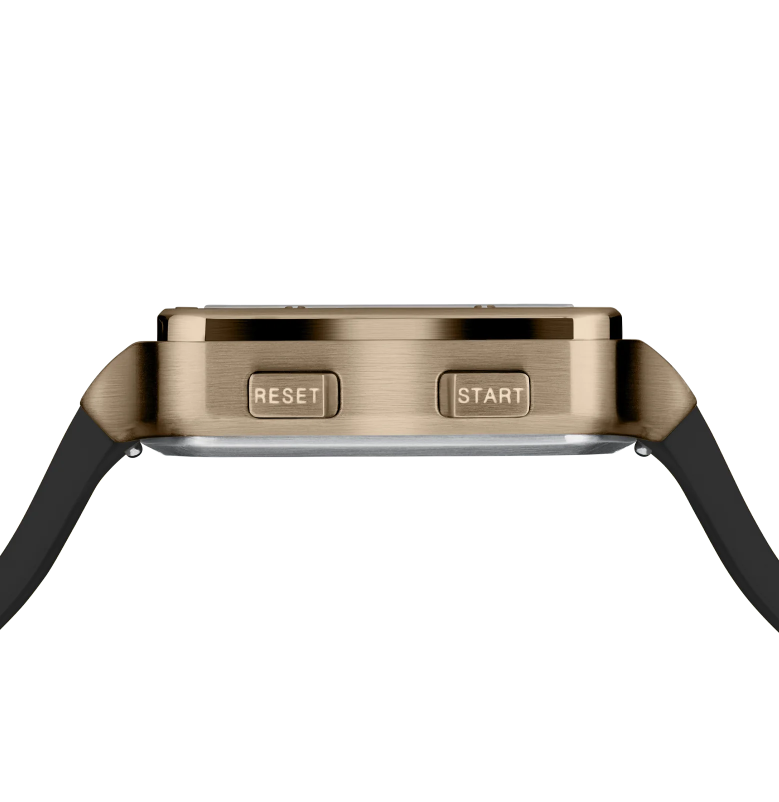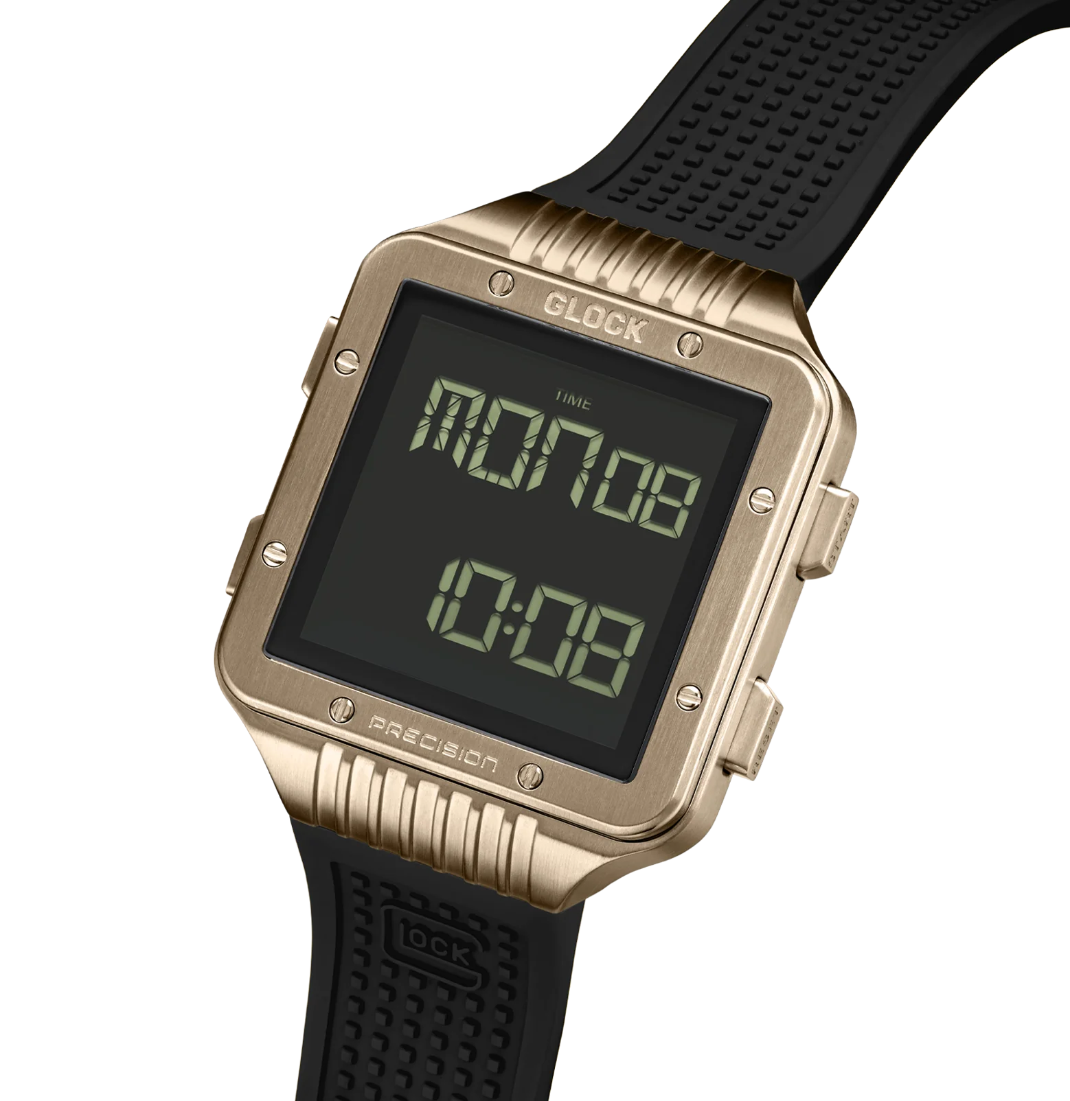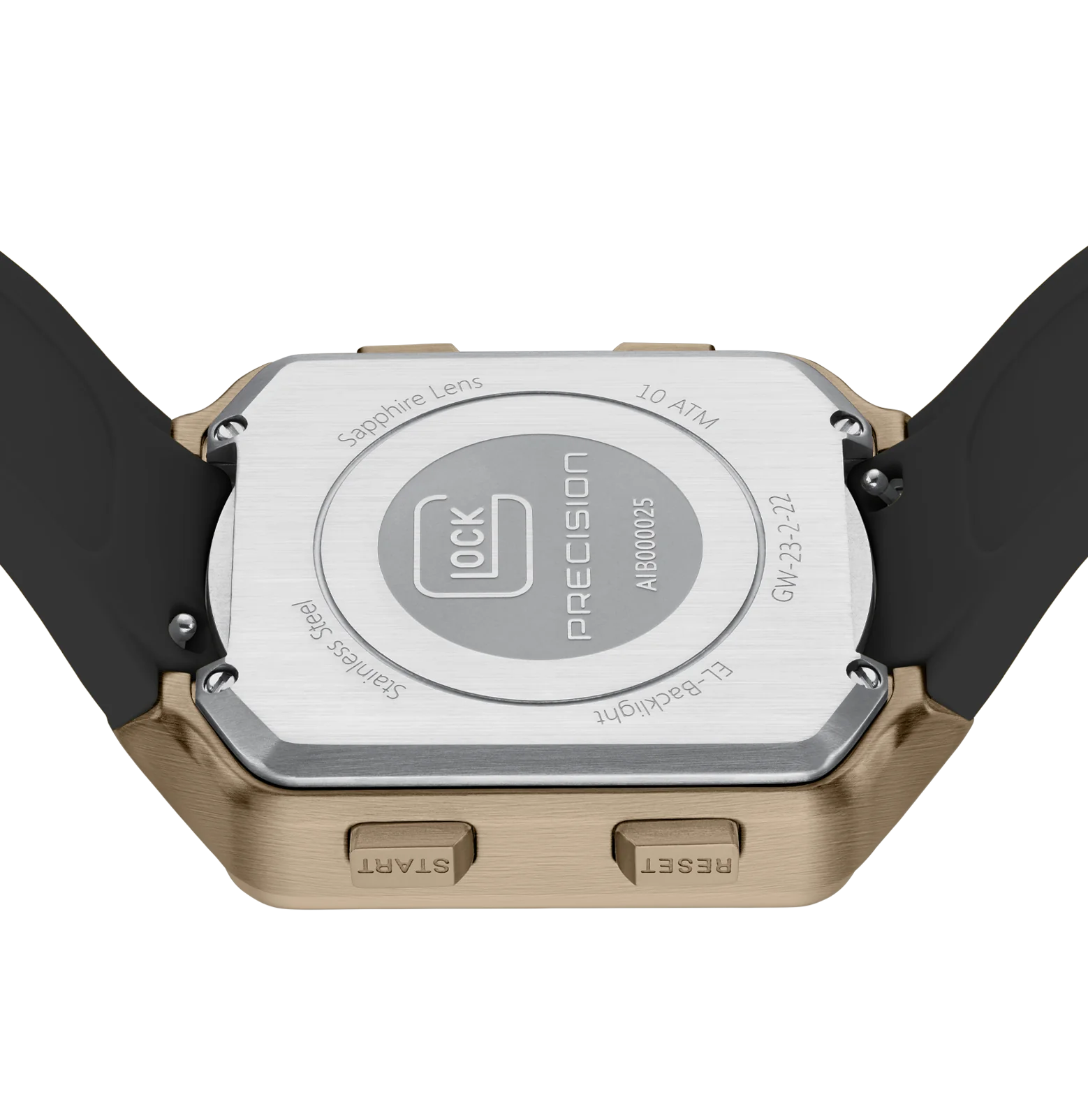 This digital watch features a coyote-tone square stainless steel case enclosing a digital display that is set against a deep black background. The black silicone strap, featuring GLOCK’s RTF structure, balances comfort with a sporty aesthetic. With a sapphire crystal, a chronograph function, and a 10 ATM water-resistance rating, this watch has quite the impressive array of technical features.