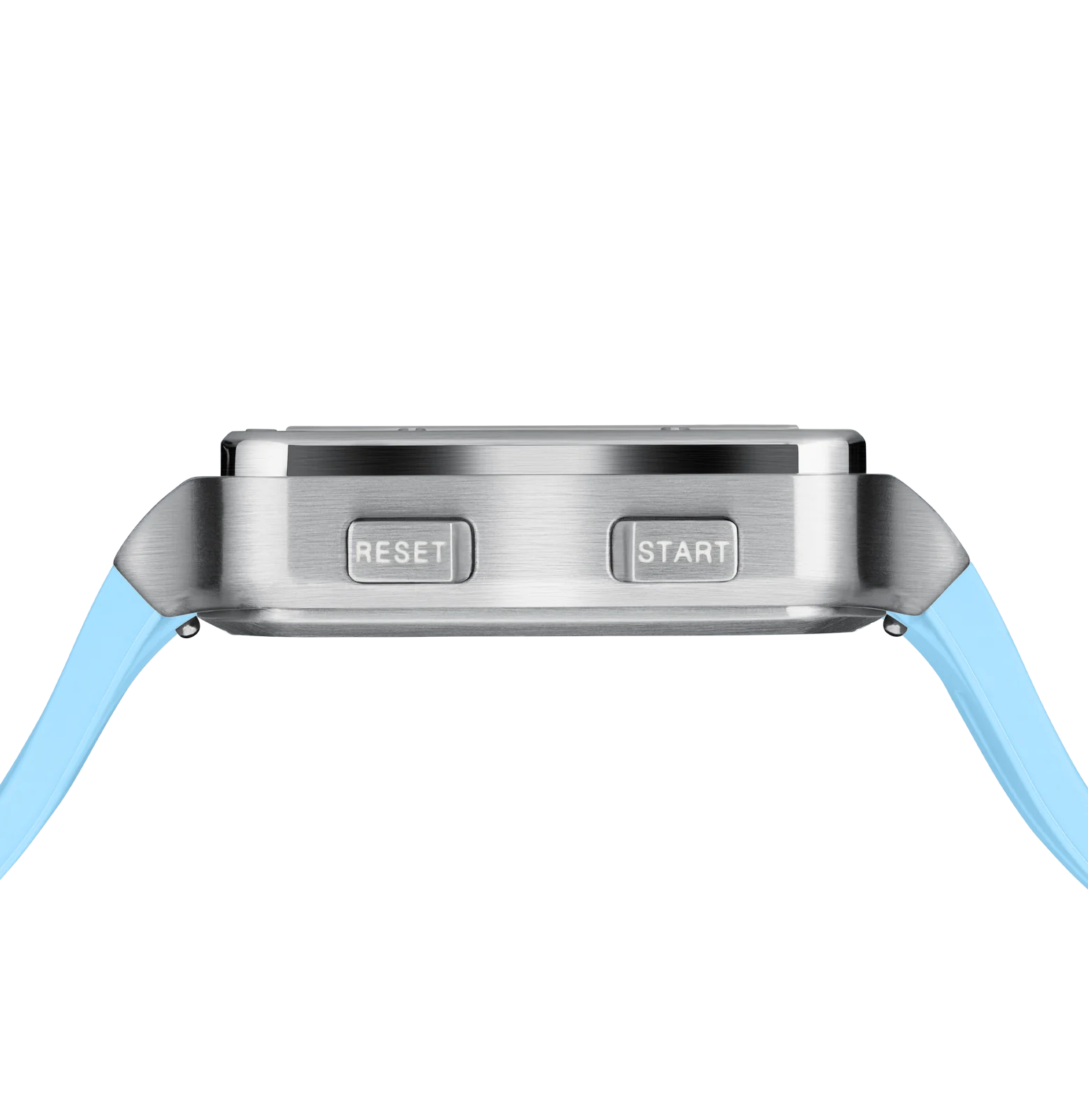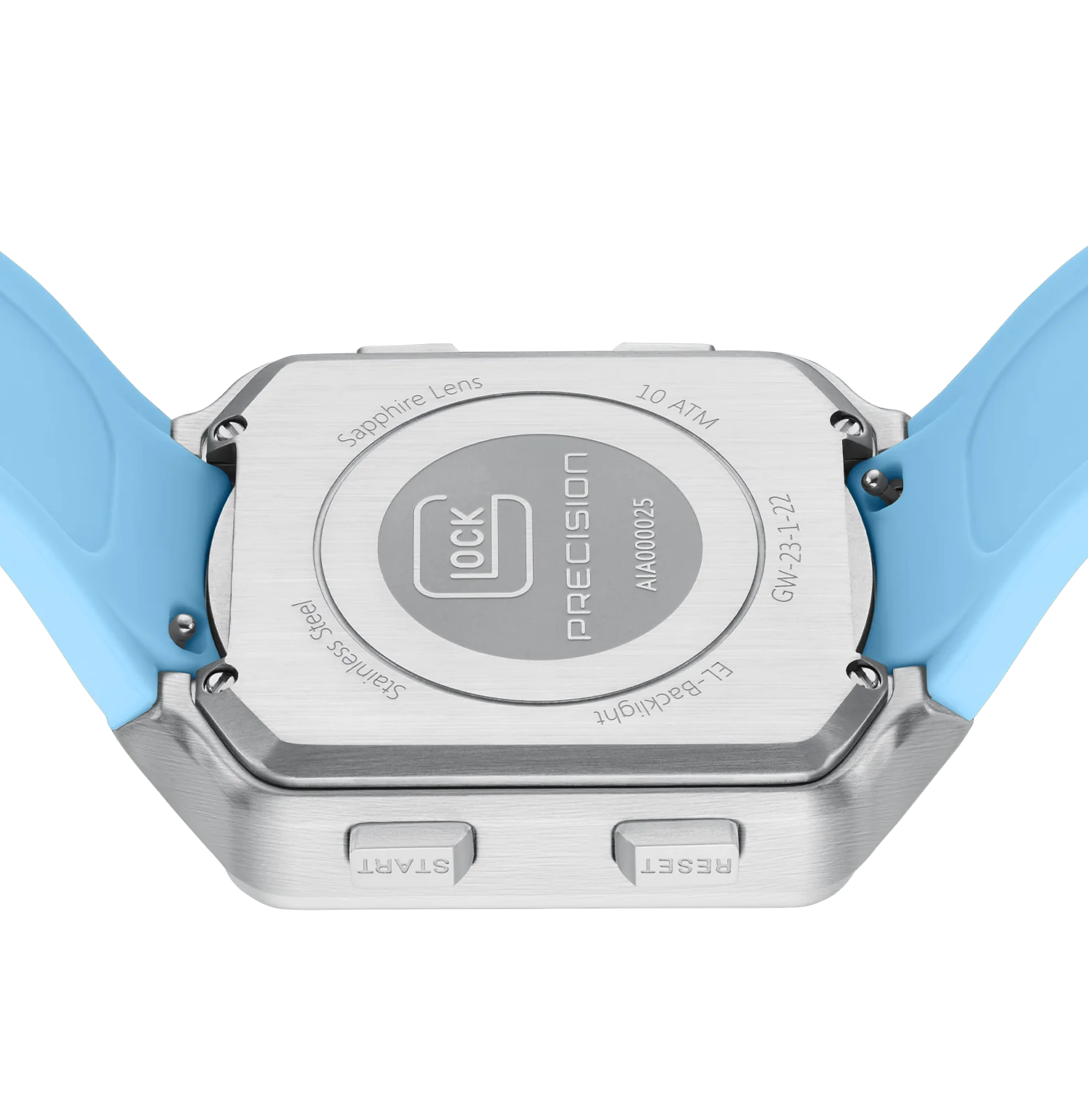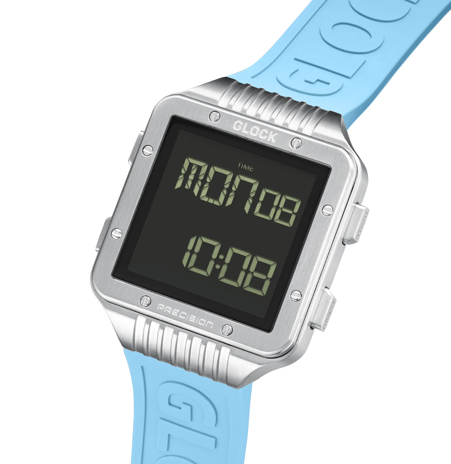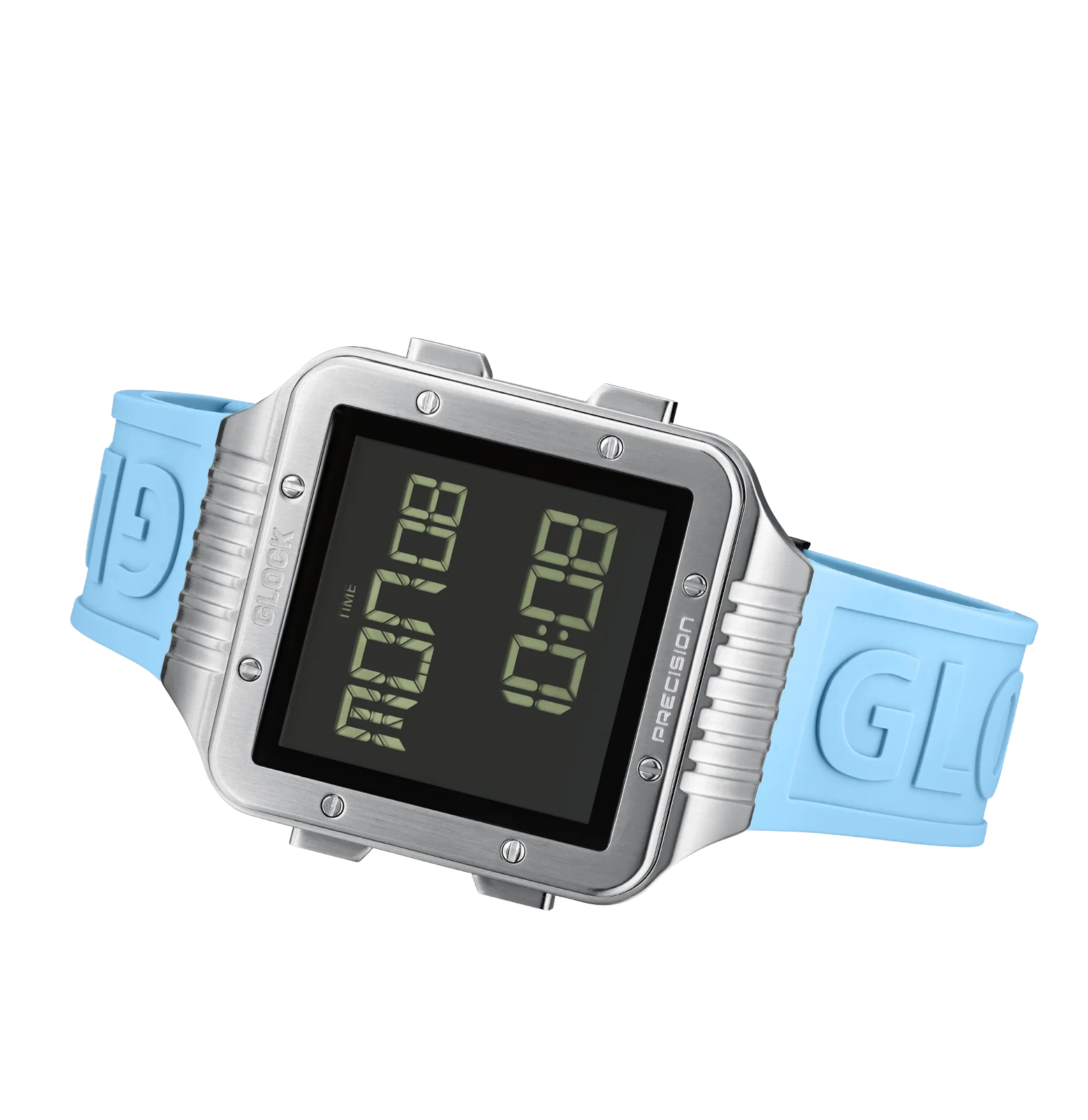 This digital watch features a square stainless steel case surrounding a digital display against a black backdrop. The light blue silicone strap with distinctive GLOCK lettering strikes a balance between comfort and a sporty aesthetic. With a sapphire crystal, a chronograph function, and a 10 ATM water-resistance rating, it stands out with its array of technical features.