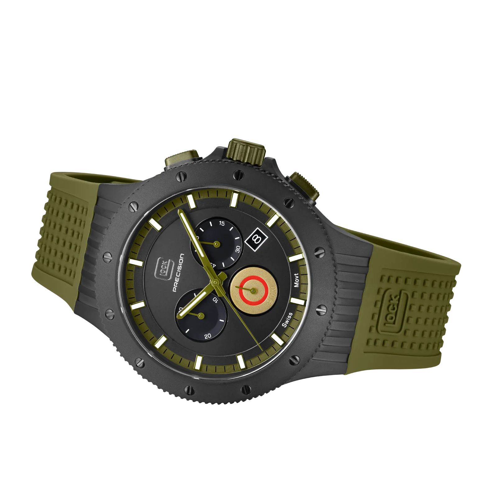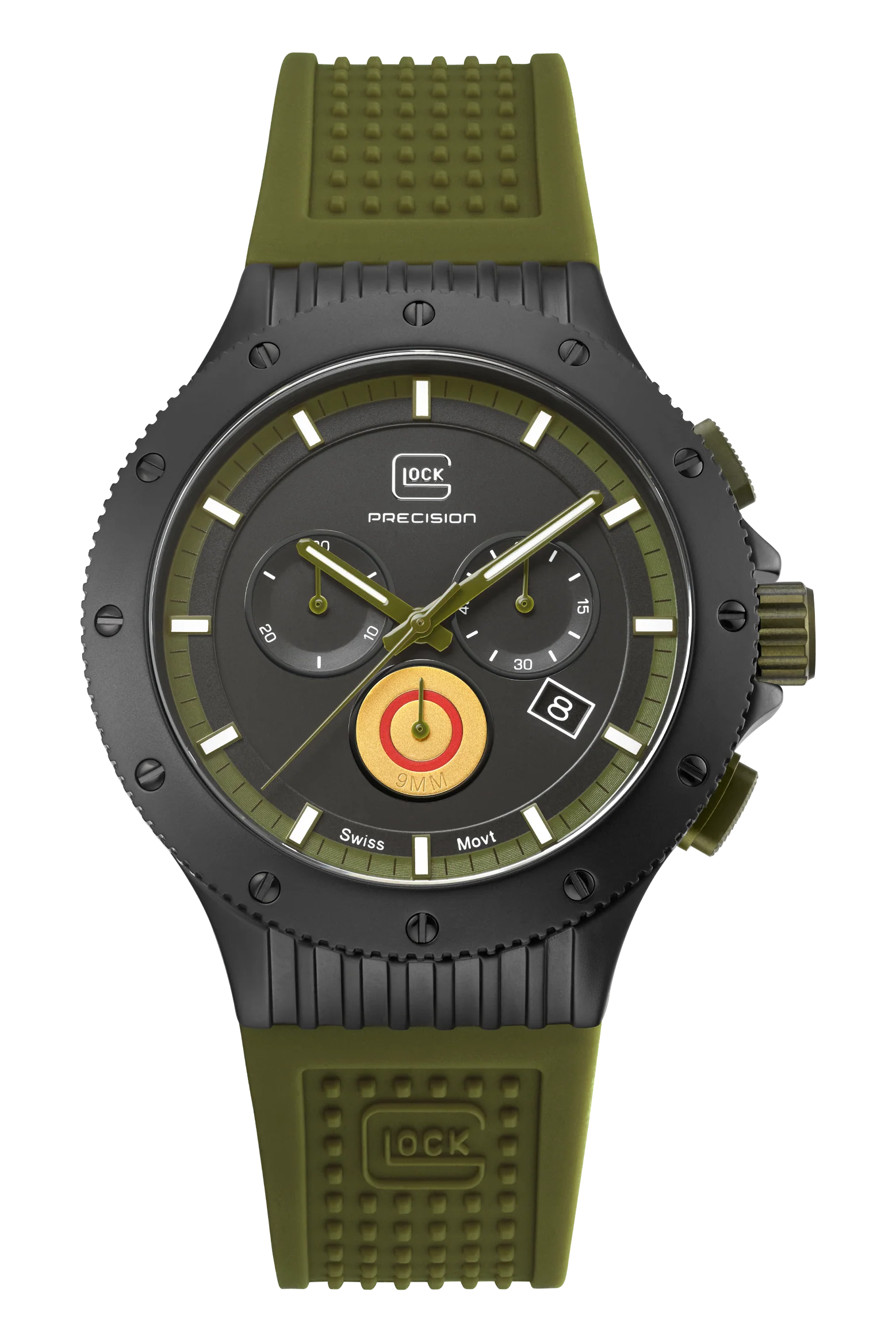 This 7500-piece limited-edition wristwatch symbolizes precision craftsmanship. Its black titanium case is enriched by the distinctive detail of a bullet casing on the dial. Hands and indices with Swiss Super-LumiNova® ensure readability of the time even in low-light conditions. The watch is powered by a reliable Swiss movement, features a chronograph function, and boasts a water-resistance rating of 20 ATM. To offer versatility of style, each order comes with two interchangeable straps: a green silicone strap with GLOCK's RTF texture and a black mesh strap.