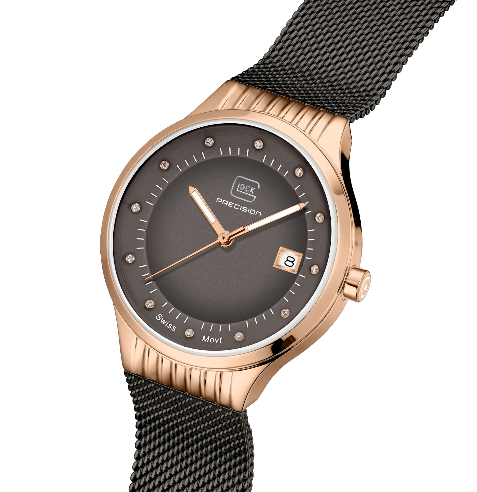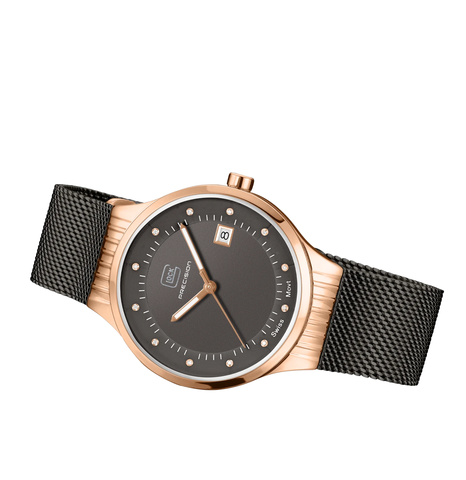 This watch radiates classic elegance. Its shiny, rose gold-tone stainless steel case and gunmetal mesh band surround a reliable Swiss movement. The color-coordinated dial, accented by twelve genuine diamonds as well as hands featuring Swiss Super-LumiNova®, introduces an additional level of luxury. With 10 ATM water resistance, it unites premium functionality with timeless design.
