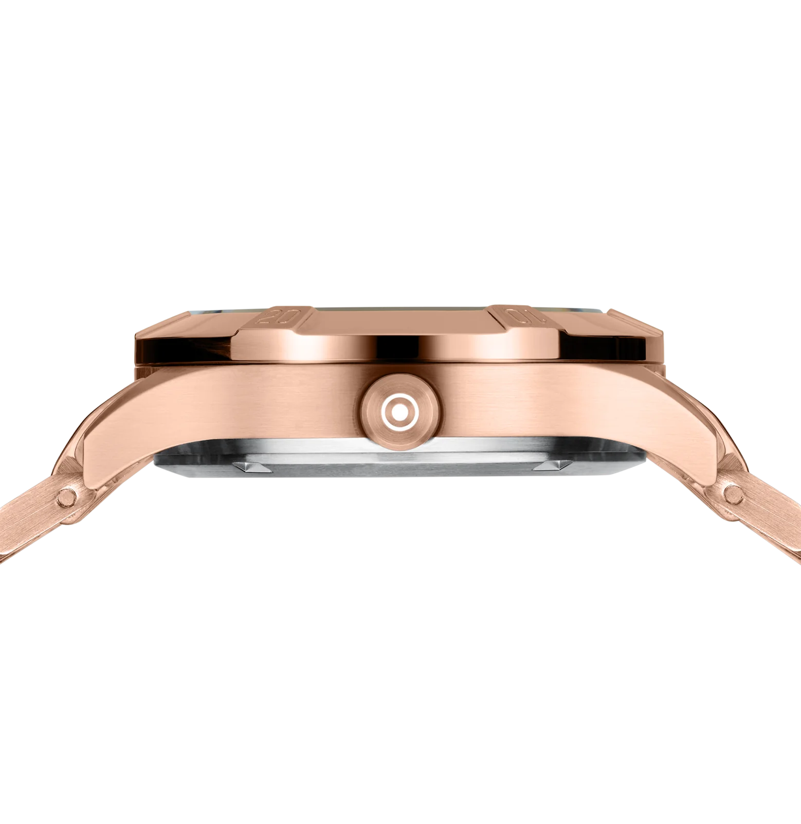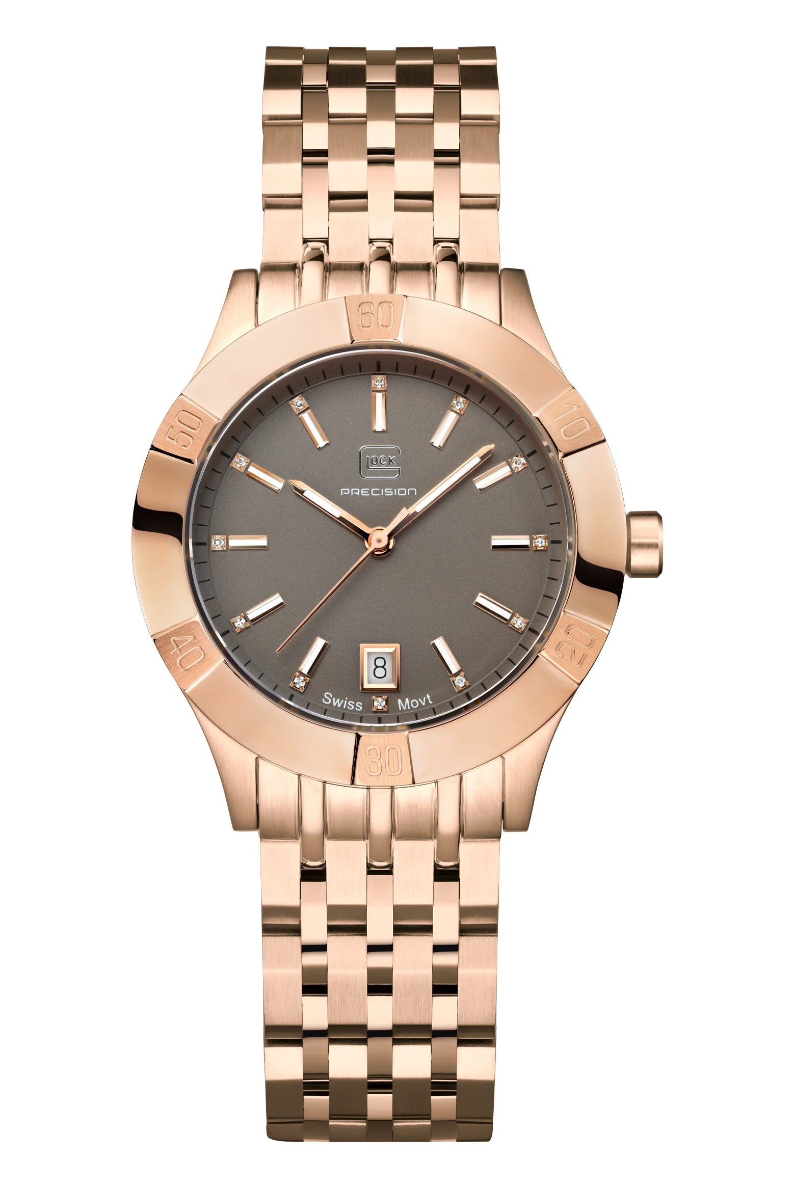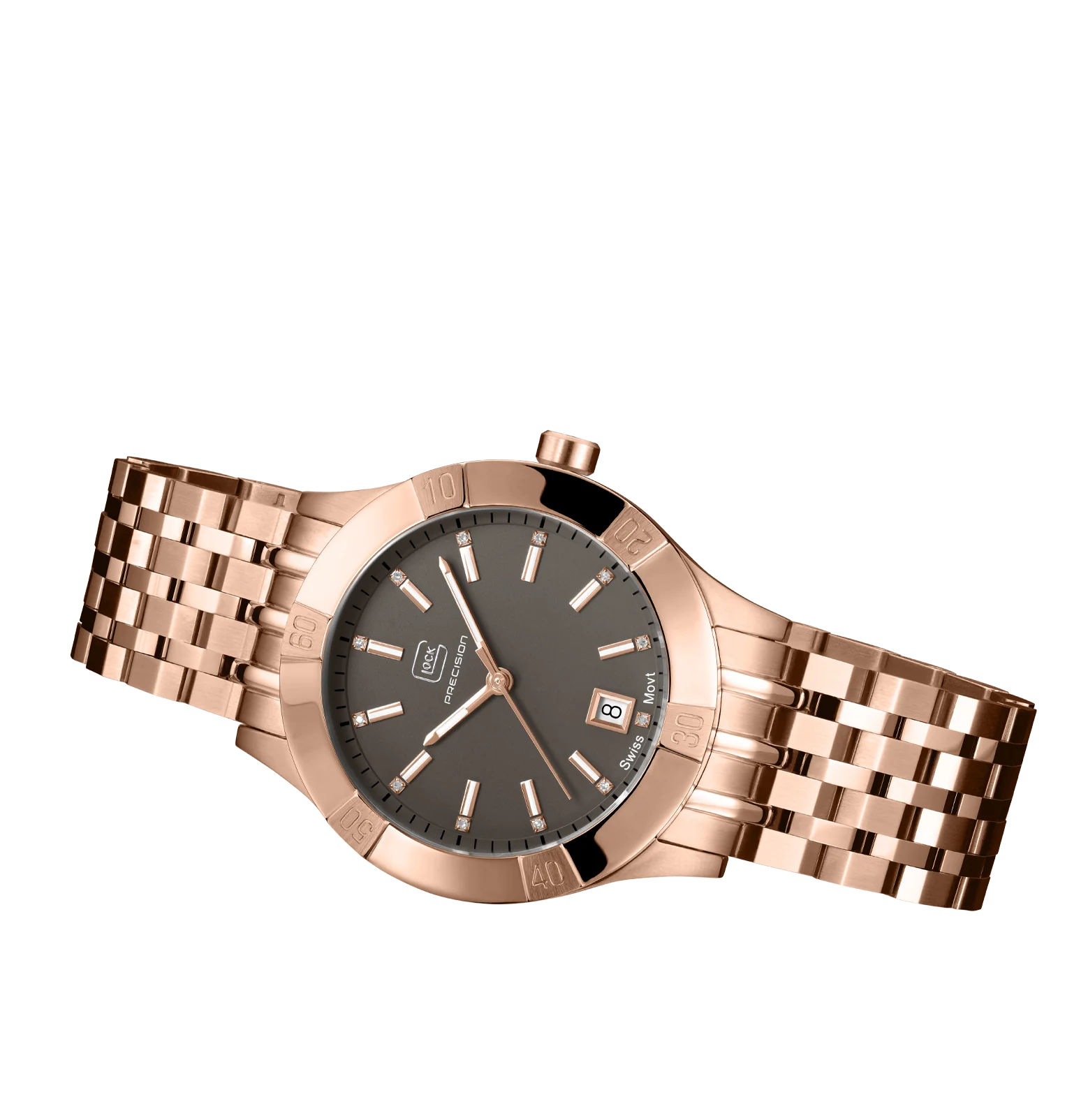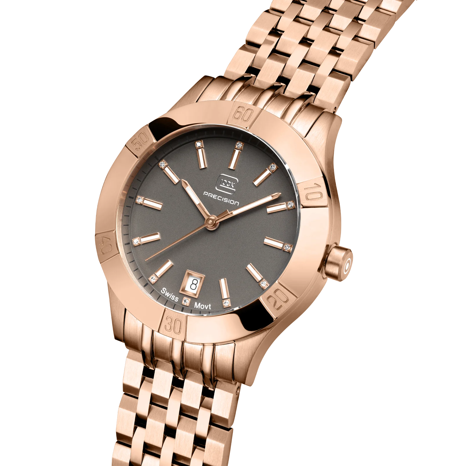 The brushed rose gold-tone stainless steel case is accentuated by a polished bezel. The color-coordinated link strap harmoniously complements the gray dial, which is brightened by hands and indices with Swiss Super-LumiNova®. With a precise Swiss movement and a reliable 10 ATM water-resistance rating, this watch fuses functionality with style.