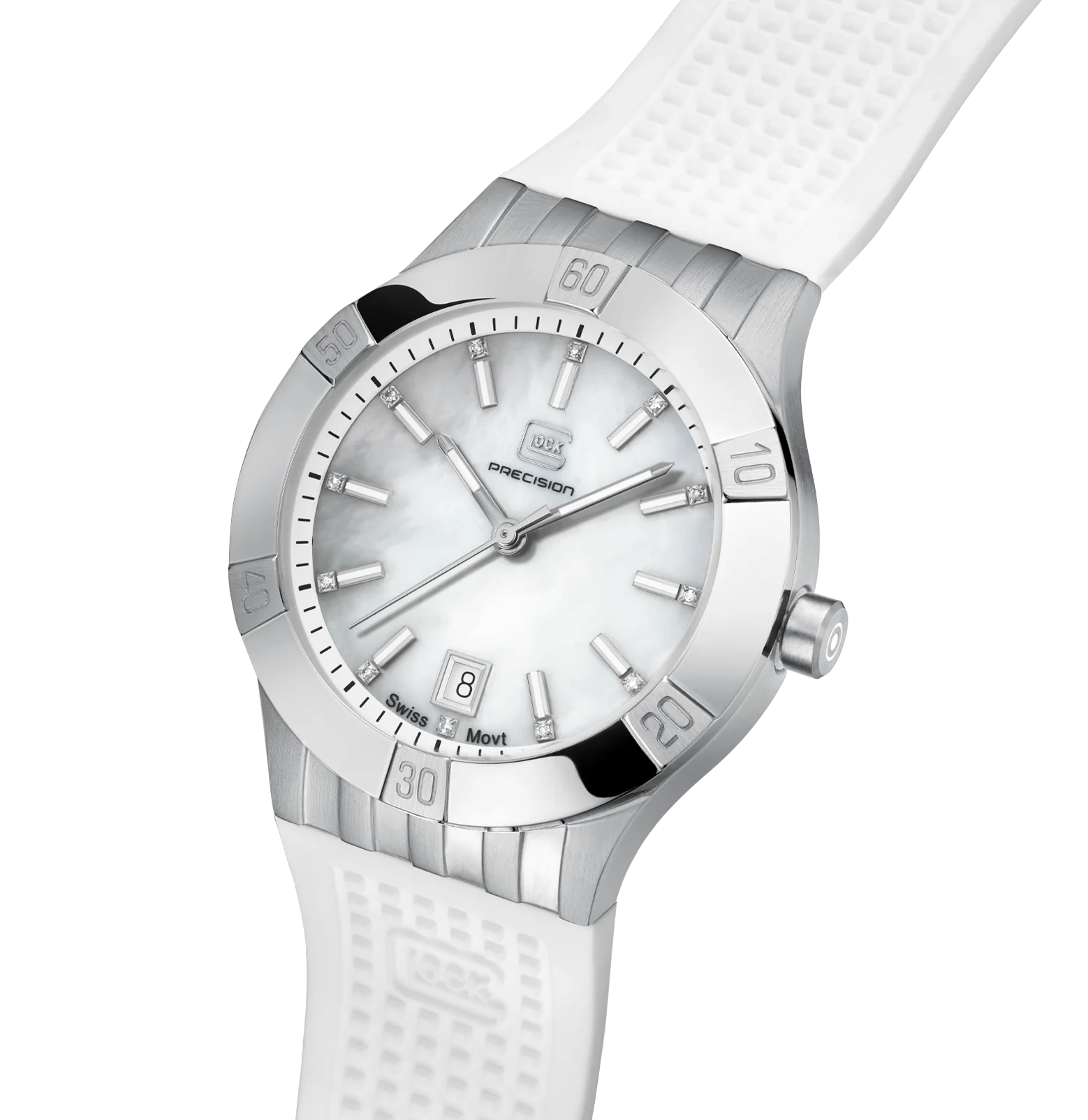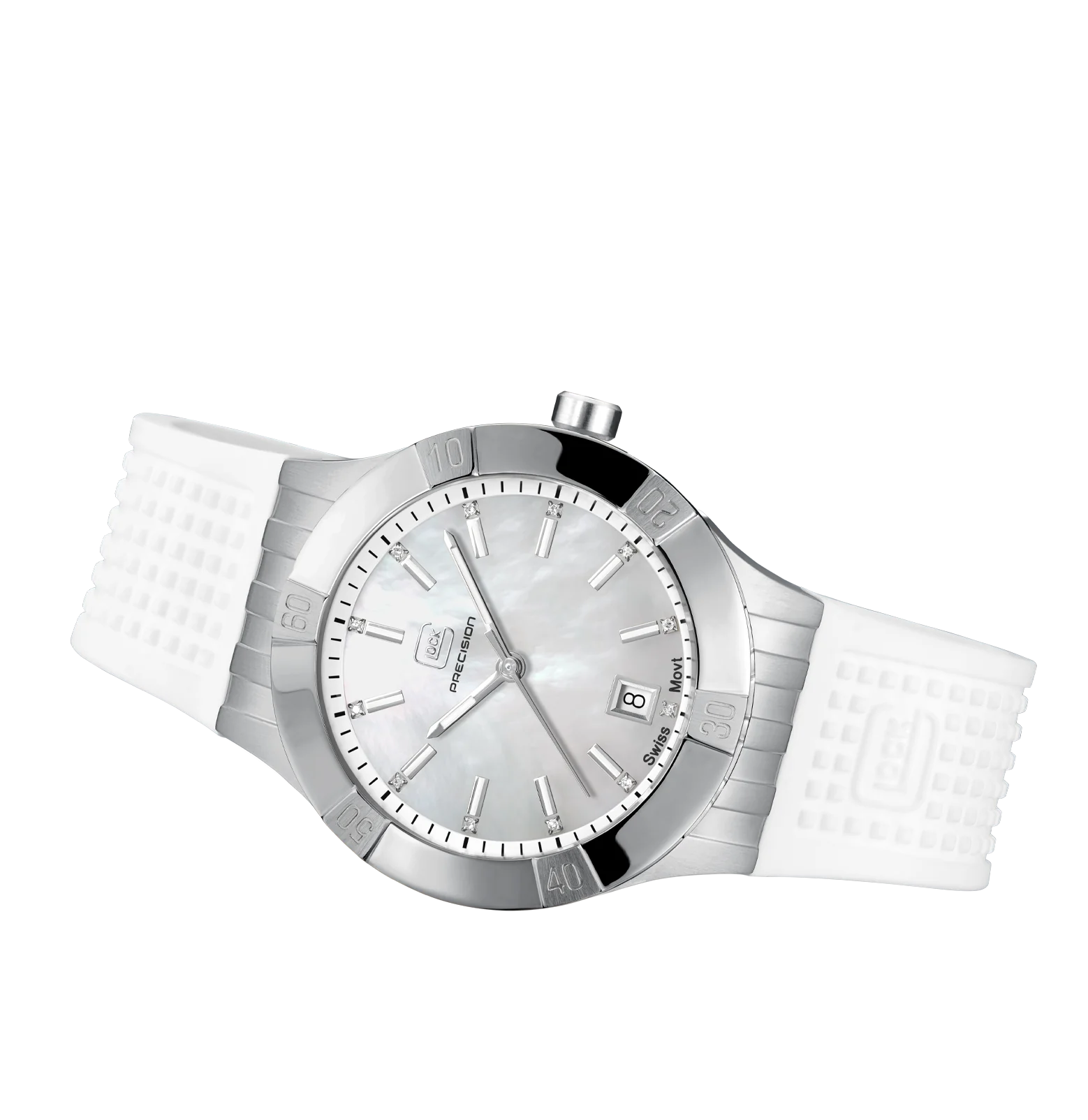 Crafted from brushed stainless steel, this watch pairs with a white silicone strap featuring GLOCK's signature RTF texture. The white mother-of-pearl dial showcases hands and indices with Swiss Super-LumiNova® and is adorned with twelve genuine diamonds, protected by scratch-resistant sapphire crystal. Powered by a precise Swiss movement and featuring a 10 ATM water-resistance rating, this watch balances functionality and style.