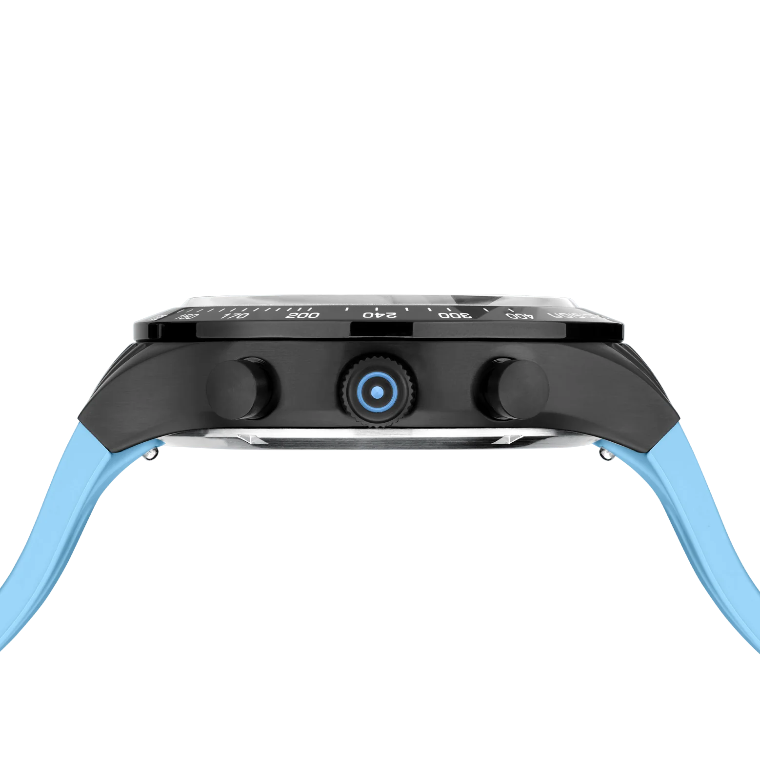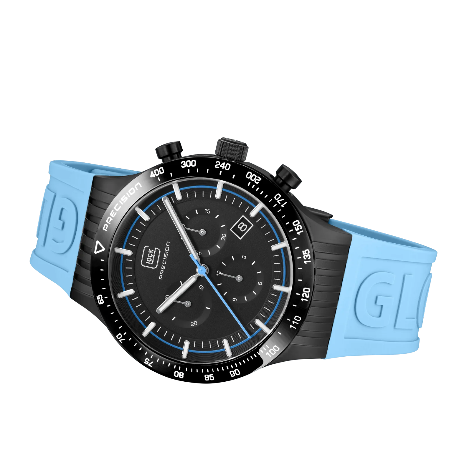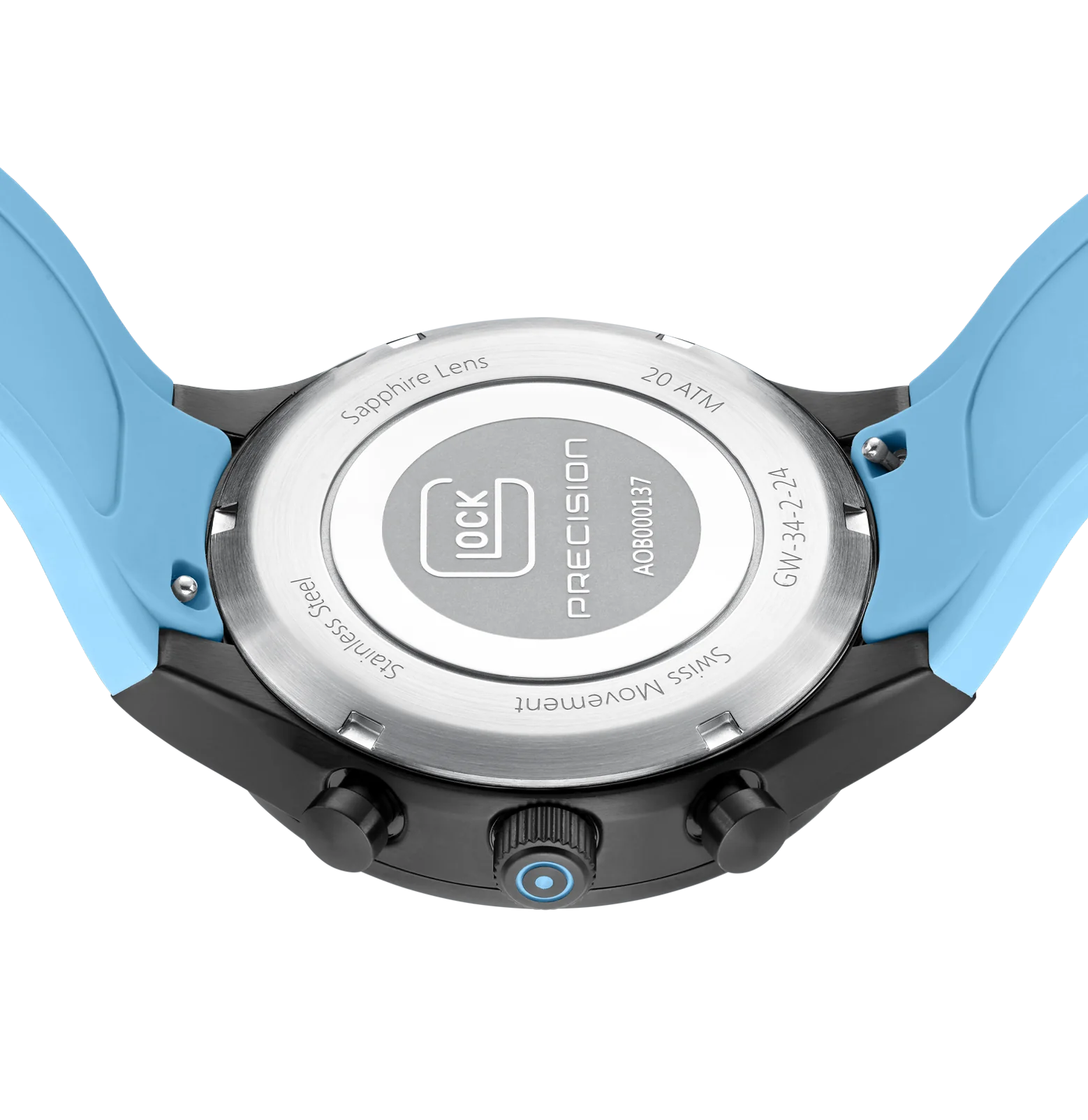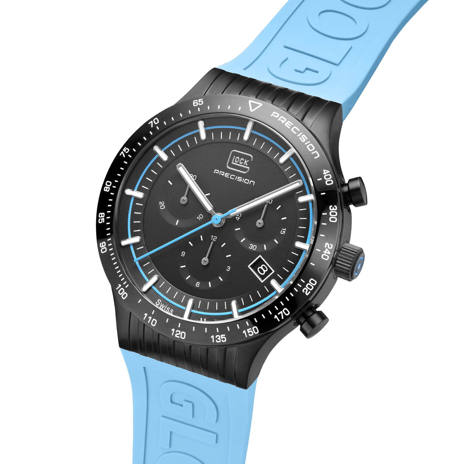 Encased in brushed black stainless steel, this watch boasts a blue silicone strap with GLOCK lettering. Powered by a Swiss movement, it guarantees timekeeping accuracy. Enhanced by a chronograph function, hands and indices with Swiss Super-LumiNova®, and a 20 ATM water-resistance rating, it represents precision, reliability, and style.
