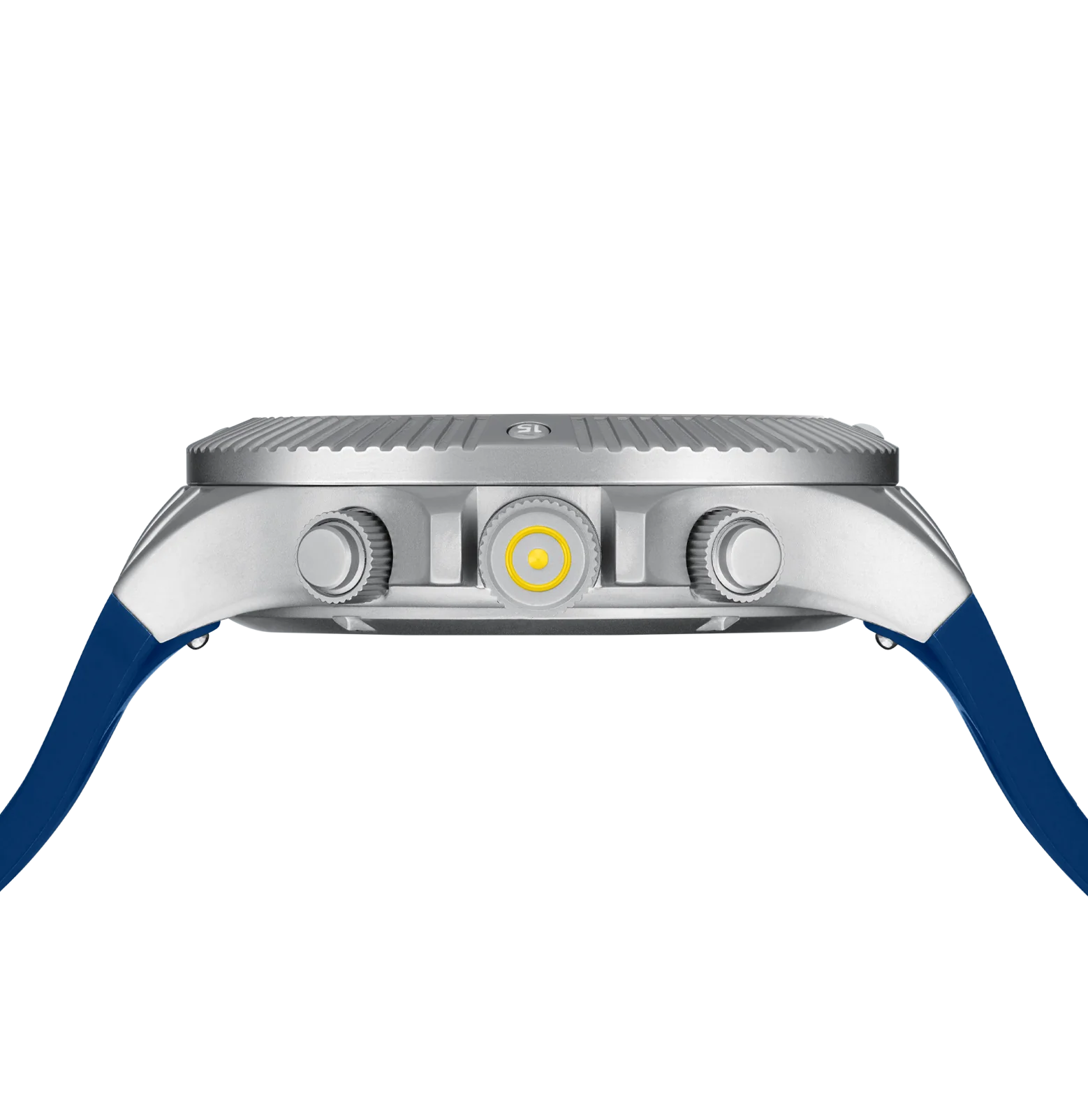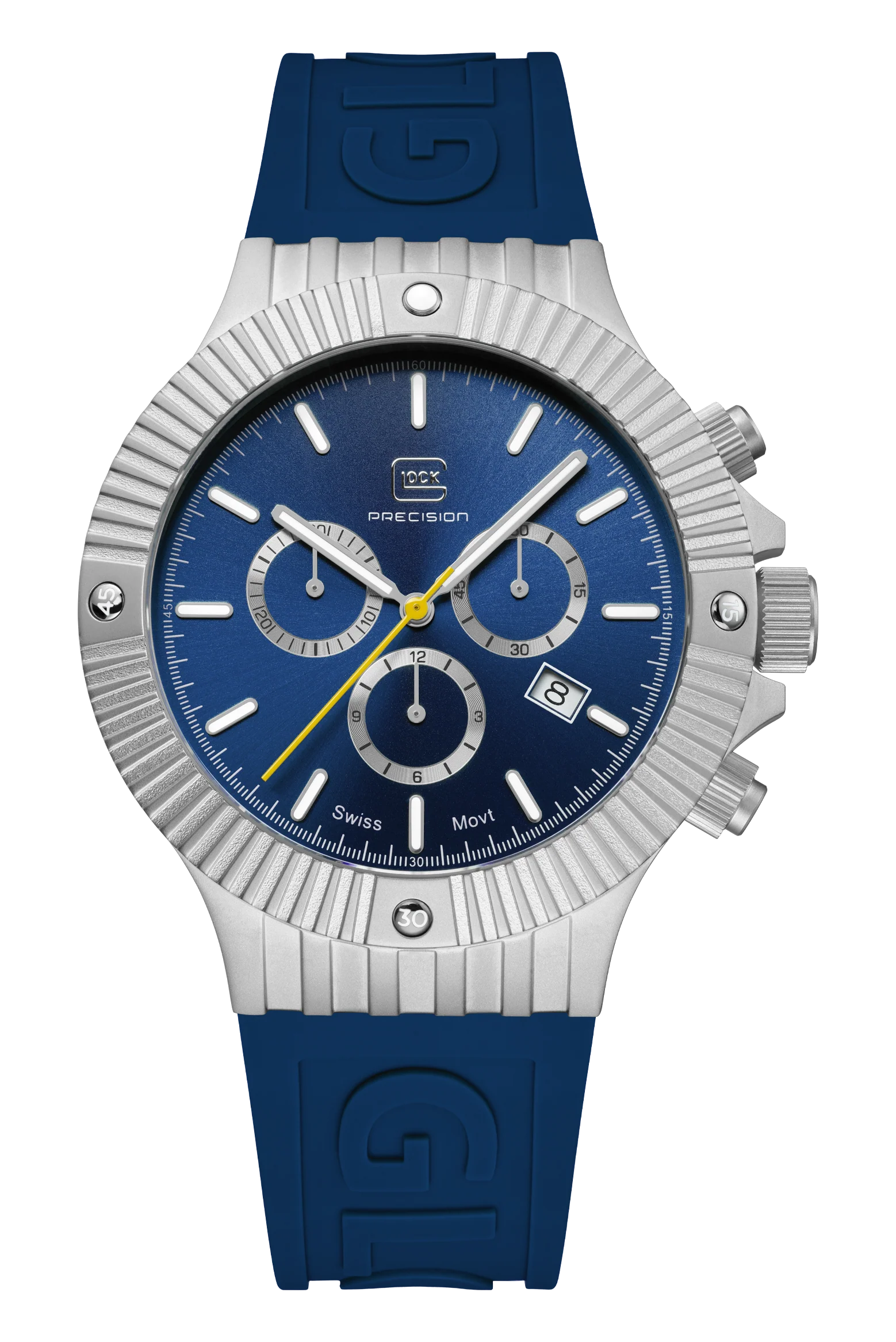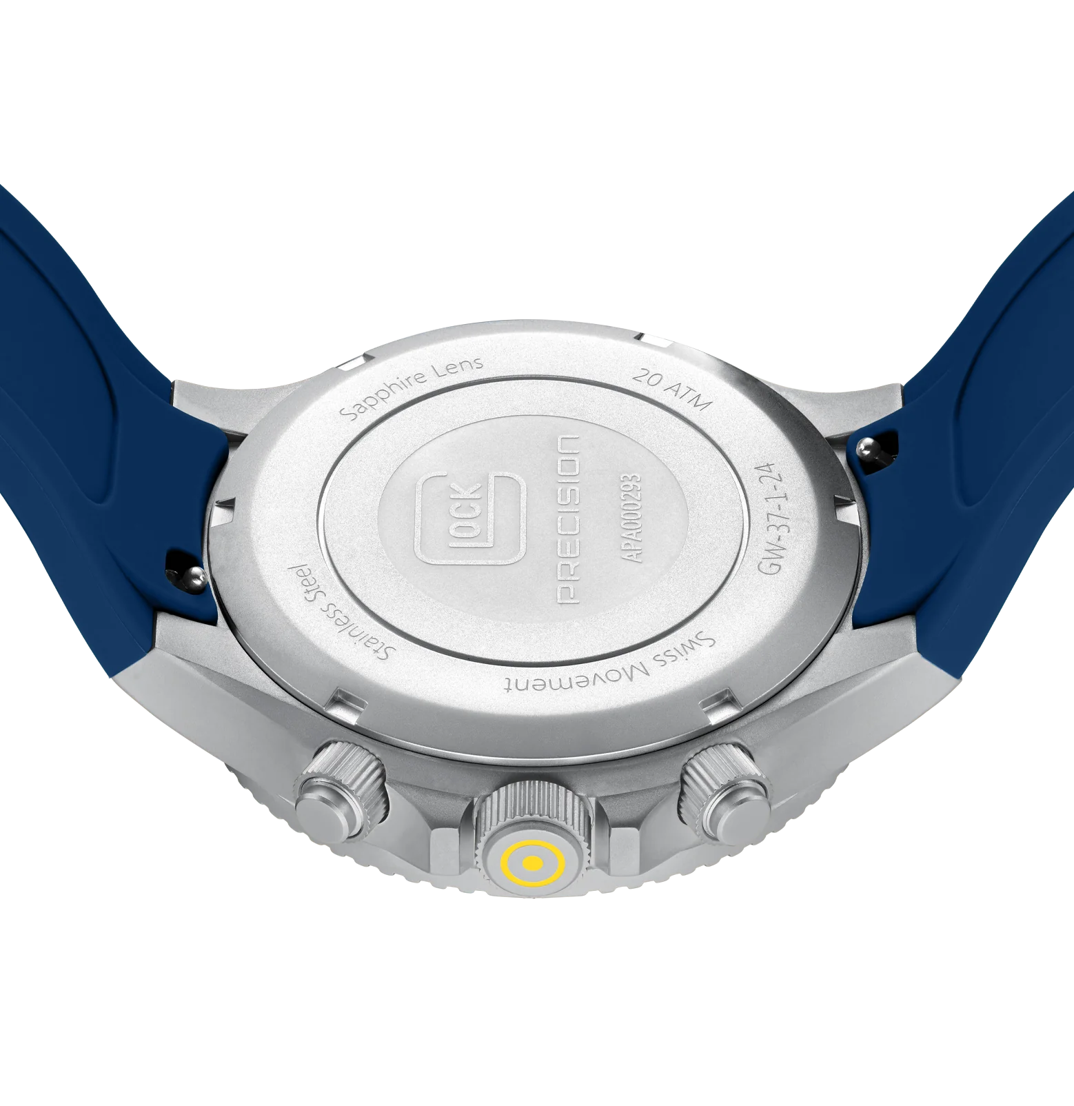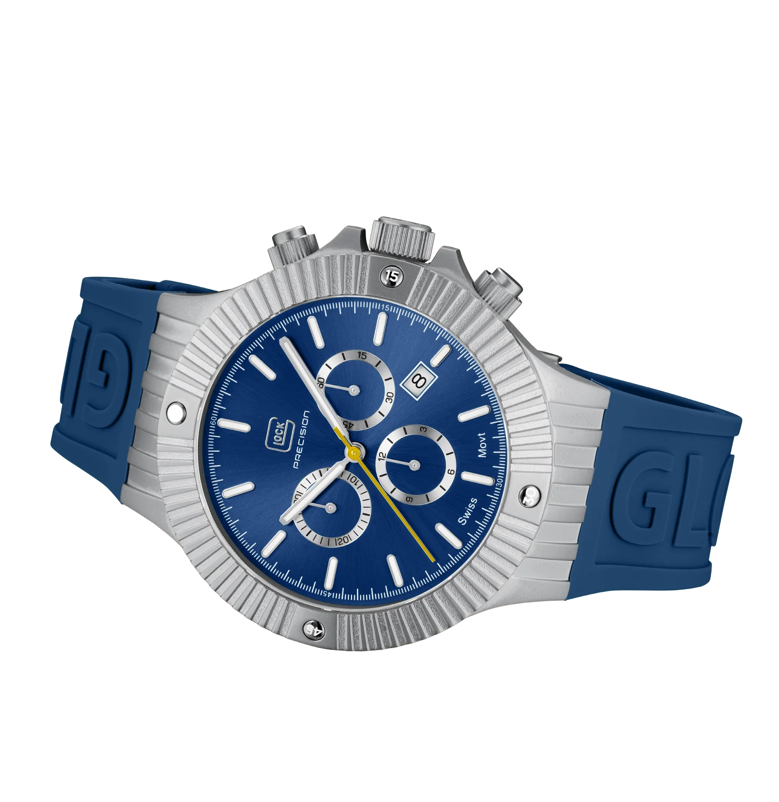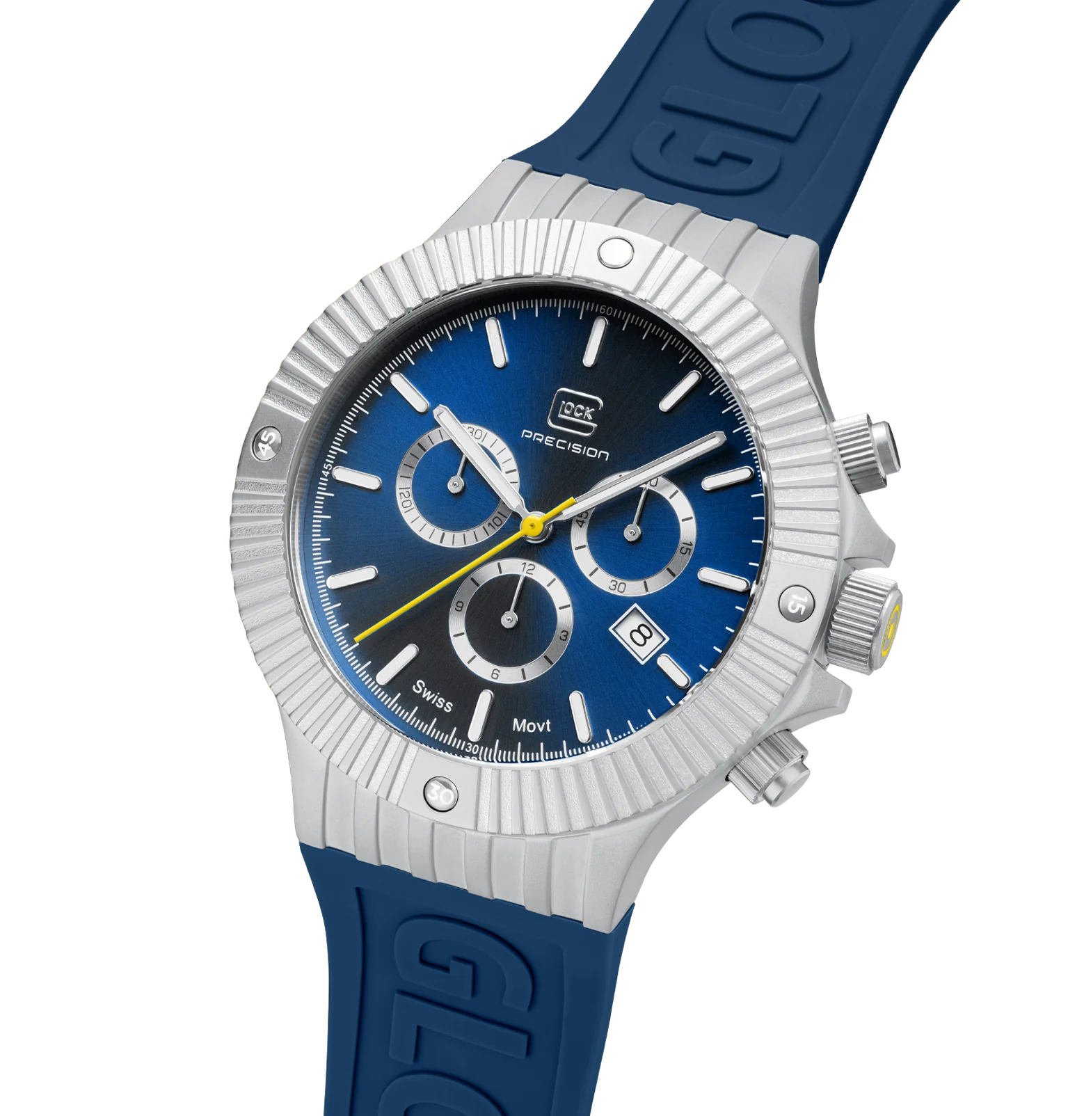 The sandblasted stainless steel case pairs with the blue silicone strap featuring GLOCK lettering. The blue dial is protected by scratch-resistant sapphire crystal. Hands and indices featuring Swiss Super-LumiNova® enhance clarity, while the yellow second hand adds a distinctive touch to the dial. With a Swiss movement, a chronograph function, and a 20 ATM water-resistance rating, this watch exemplifies precision and reliability.