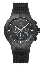 This watch combines precision and style. Its elegant black stainless steel case complements the matching silicone strap with GLOCK's RTF texture. The black dial, accentuated by silver-tone hands and indices with Swiss Super-LumiNova®, is protected by resilient sapphire crystal. Powered by a Swiss movement, it guarantees reliability and accuracy. Accompanied by a chronograph and a 20 ATM water-resistance rating, this timepiece is certain to be a versatile companion for adventures.