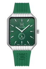 Precision takes center stage with this timepiece. Housed inside sandblasted stainless steel and shielded by sapphire crystal, its green dial is complemented by silver-tone hands and indices with Swiss Super-LumiNova®. The green silicone strap, featuring the GLOCK RTF structure, ensures a secure fit. With a 5 ATM water-resistance rating and dependable Swiss movement, it exemplifies robust functionality and accuracy. Thus, this watch is not only a timekeeping instrument, but also a reflection of dedication to precision, durability, and style.