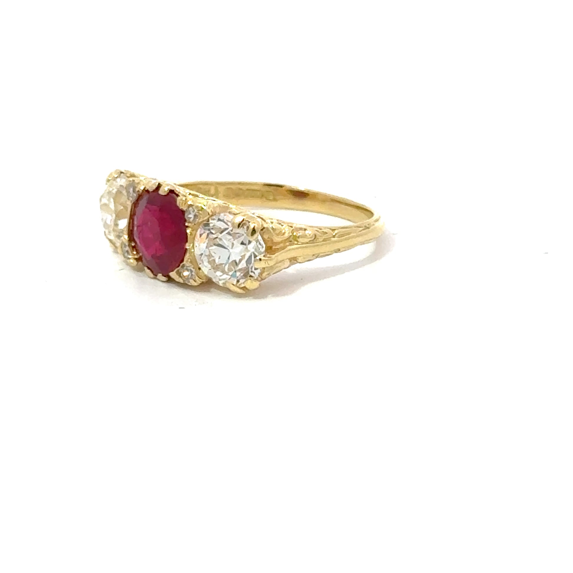 Antique 1.78ct Burma ruby ring with side-set European-cut diamonds. Victorian-era estate piece, fully certified and reviewed for condition and value. Order now!