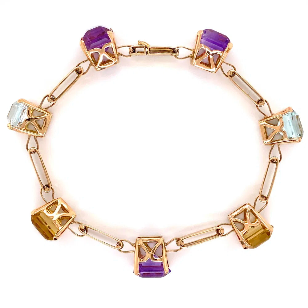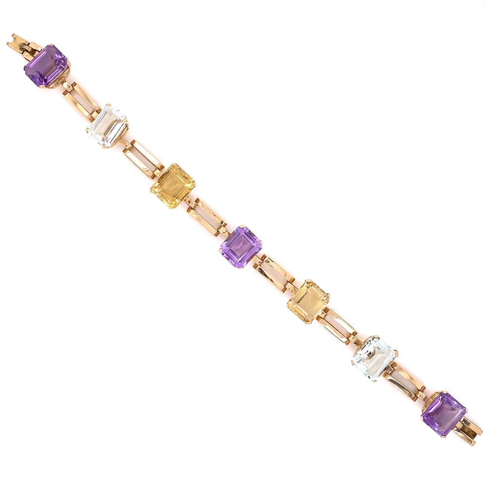 This exquisite 1940s bracelet showcases the timeless elegance of vintage craftsmanship. Featuring 45.0 carats of stunning gemstones—aquamarine, amethyst, and citrine—set in lustrous 18K yellow gold, this piece captures the glamorous Art Deco spirit of its era. The substantial 28.3g weight ensures a luxurious presence on the wrist, while the harmonious blend of cool and warm stone hues creates a captivating color palette. A true collector's treasure, this retro bracelet combines historical significance with enduring beauty, making it an investment-worthy addition to any fine jewelry collection.