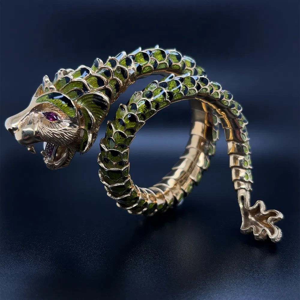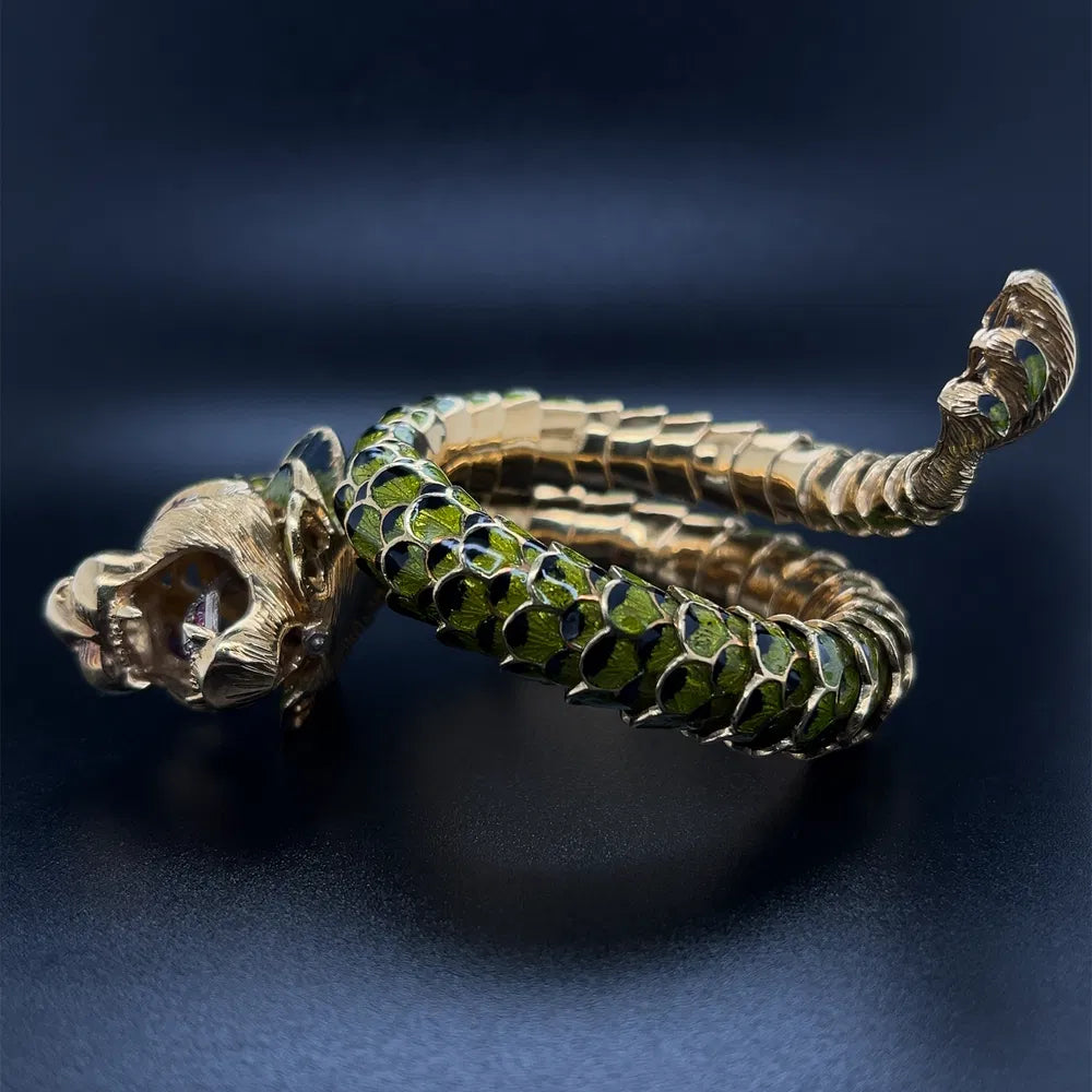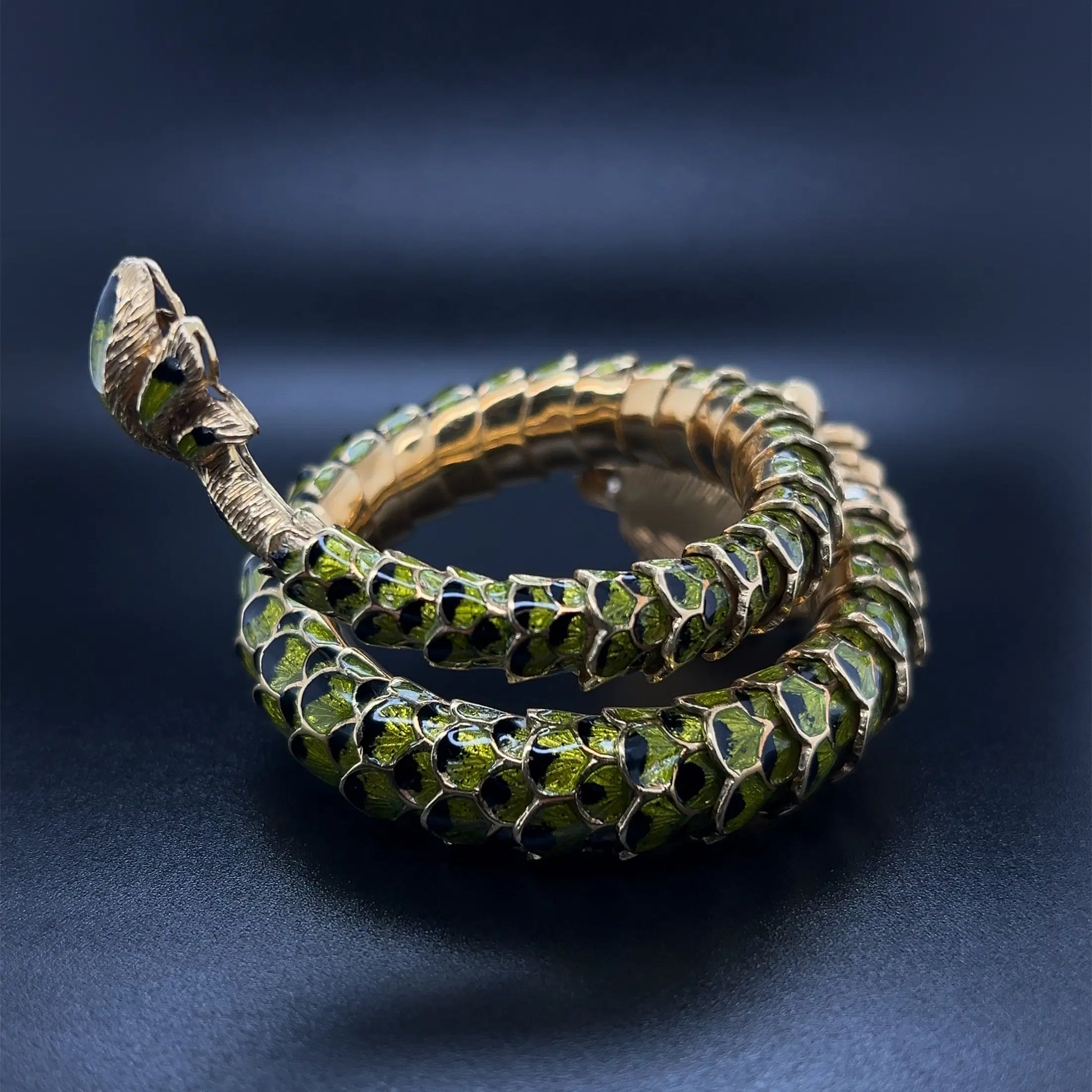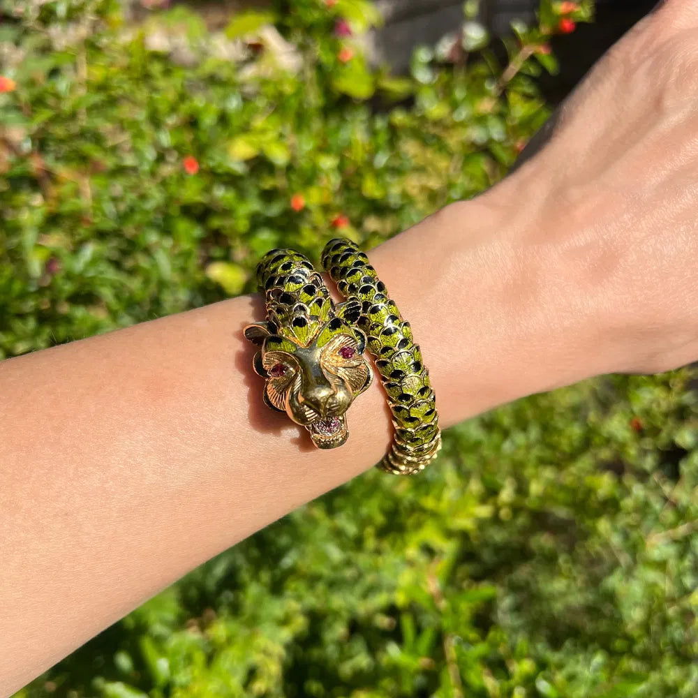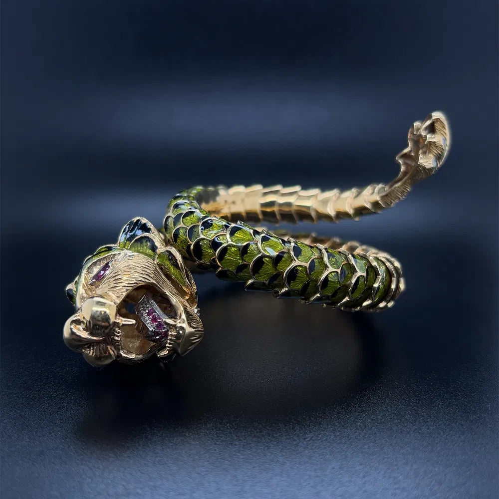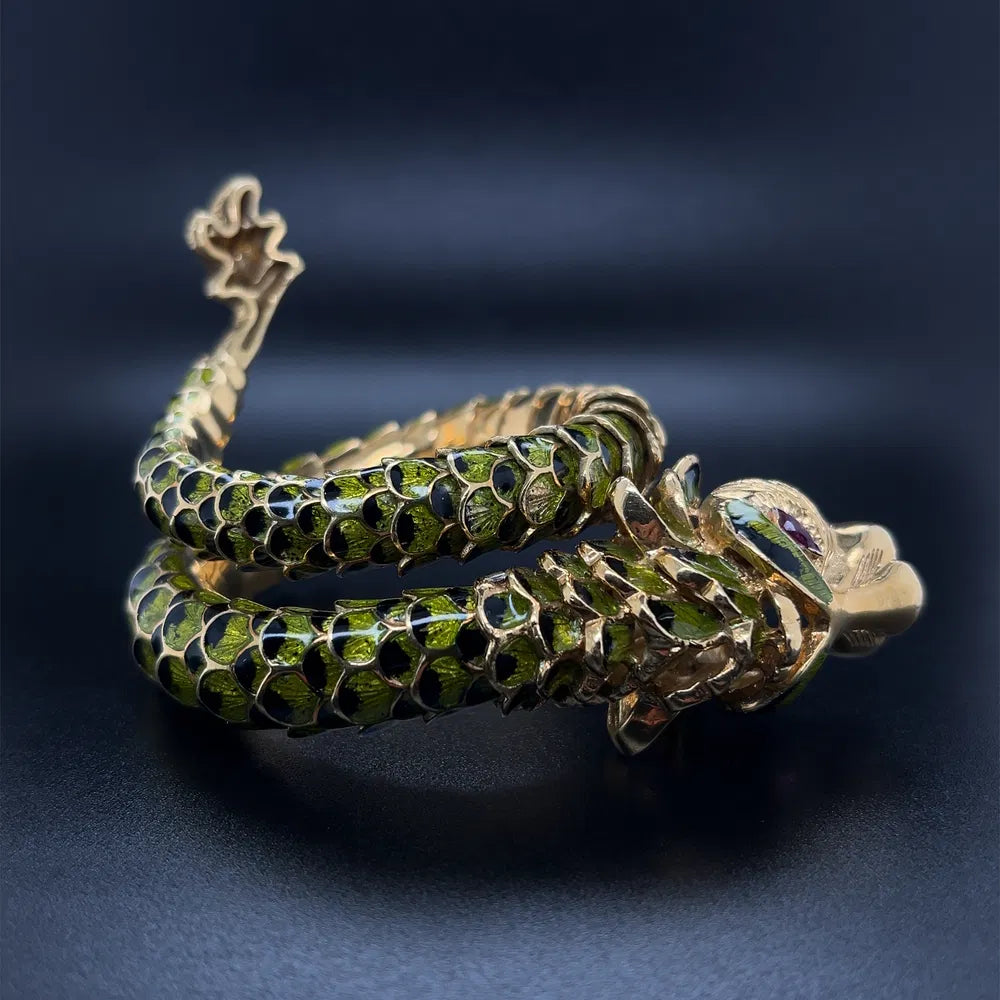 Hinged serpent cuff bracelet in 18K gold with ruby eyes and coiled design. Articulated construction, inspected for authenticity and fine detailing. Order now!