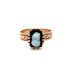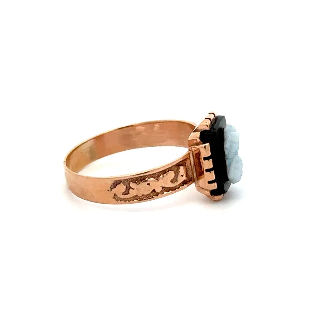 Elevate your jewelry collection with this captivating 9K rose gold morning band ring, featuring an intricately carved sardonyx cameo inspired by Victorian design. The warm blush tones of rose gold frame the stone's striking contrast of cream and deep brown layers, creating an heirloom-quality piece that commands attention. This ring celebrates classical beauty and refined taste, making it an unforgettable choice for those seeking distinctive jewelry with genuine character. Whether worn daily or reserved for special occasions, it's a conversation starter that speaks to your appreciation for artisanal craftsmanship and timeless style.