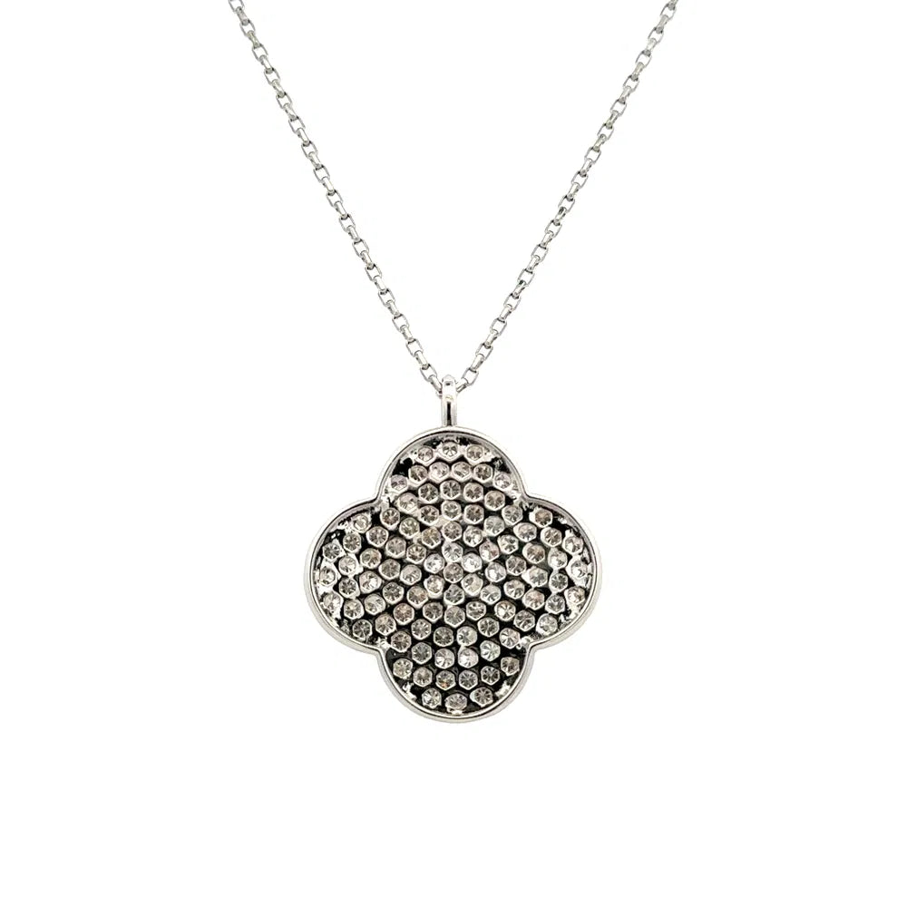 This exquisite platinum pendant necklace captures the refined beauty of the iconic Alhambra design with 3.00 carats of radiant brilliant-cut diamonds set in an intricate pave pattern. Each stone is meticulously positioned to maximize light reflection, creating an enchanting display of sparkle that draws admiration. The graceful 20-inch chain provides the perfect length for layering or wearing solo, making it an ideal choice for those seeking a statement piece that transcends trends. Crafted for the discerning collector who values both artistry and enduring quality.