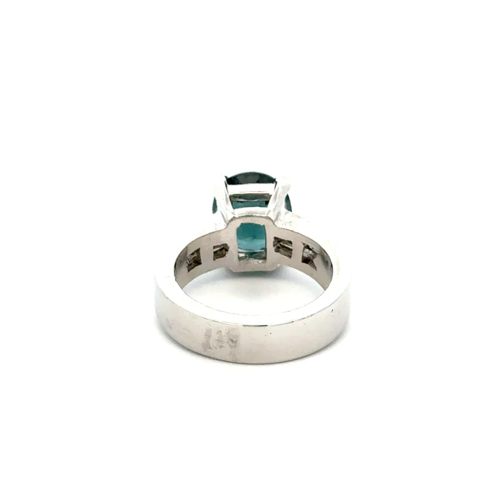 This stunning platinum ring showcases a magnificent 3.16-carat tourmaline, certified by GIA, paired with 0.40 carats of elegant baguette diamonds. The sophisticated design combines the tourmaline's rich, captivating color with the brilliant sparkle of precisely cut baguettes, creating a truly distinctive piece. Perfect for those seeking a unique alternative to traditional solitaire rings, this ring offers timeless elegance with exceptional gemstone quality. Size 4.75