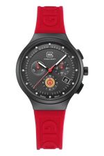 Elegant design combined with technical features. Framed in black sandblasted stainless steel, the diamond-studded black dial gives the watch an elegant appearance. Hands with Swiss Super-LumiNova® ensure clear readability, while the red silicone strap adds a striking accent. Driven by a Swiss movement, this watch features a chronograph function and a 10 ATM water-resistance rating, presenting high-quality design without compromising on technology.