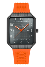 Encased in gunmetal-finish stainless steel and protected by scratch-resistant sapphire crystal, this watch offers clarity and durability. Its square dial showcases hands and indices with Swiss Super-LumiNova® in vibrant orange. The matching-color silicone strap features GLOCK's RTF texture, ensuring a comfortable fit. With a 5 ATM water-resistance rating and a precise Swiss movement, it is the epitome of reliability.