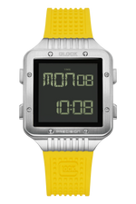 This digital watch features a square stainless steel case surrounding a digital display against a black backdrop. The yellow silicone strap with GLOCK's RTF texture strikes a balance between comfort and a sporty aesthetic. With a sapphire crystal, a chronograph function, and a 10 ATM water-resistance rating, it stands out with its array of technical features.