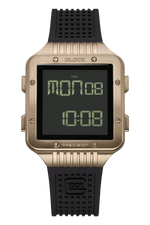 This digital watch features a coyote-tone square stainless steel case enclosing a digital display that is set against a deep black background. The black silicone strap, featuring GLOCK’s RTF structure, balances comfort with a sporty aesthetic. With a sapphire crystal, a chronograph function, and a 10 ATM water-resistance rating, this watch has quite the impressive array of technical features.