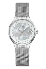 This watch radiates classic elegance. Its shiny, silver-tone stainless steel case and the color-coordinated mesh strap surround a reliable Swiss movement. The white mother-of-pearl dial, adorned with twelve genuine diamonds and featuring hands with Super-LumiNova®, adds an extra layer of luxury. With a 10 ATM water-resistance rating, it combines high-end functionality with classic design.
