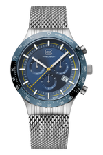 The brushed stainless steel case, emphasized by a polished blue bezel, complements the silver-tone mesh strap. The blue dial is protected by scratch-resistant sapphire crystal and features hands and indices with Swiss Super-LumiNova®. Driven by a Swiss movement and featuring a 20 ATM water-resistance rating, this watch combines precision and durability.