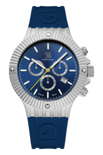 The sandblasted stainless steel case pairs with the blue silicone strap featuring GLOCK lettering. The blue dial is protected by scratch-resistant sapphire crystal. Hands and indices featuring Swiss Super-LumiNova® enhance clarity, while the yellow second hand adds a distinctive touch to the dial. With a Swiss movement, a chronograph function, and a 20 ATM water-resistance rating, this watch exemplifies precision and reliability.
