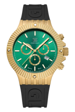 This watch captivates with its gold-tone stainless steel case and its striking interplay of colors. A green sunray dial under scratch-resistant sapphire crystal forms a harmonious blend with the athletic, black silicone strap featuring GLOCK lettering. Hands and indices with Swiss Super-LumiNova® ensure clear readability. Powered by a Swiss movement, this watch offers precision and reliability. Its chronograph function and 20 ATM water resistance combine impressive technical standards with a compelling design.