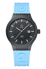 The black titanium case unites comfort and strength. The blue second hand stands out prominently against the black dial, which also serves as the perfect backdrop for the hands and indices to glow brilliantly thanks to Swiss Super-LumiNova®. The color-coordinated, blue silicone strap with GLOCK lettering ensures a secure and comfortable fit. Powered by a solar movement and with water resistance to 20 ATM, this watch offers a blend of functionality and style that meets GLOCK Watches' discerning standards.