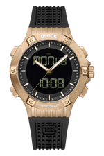 This timepiece represents modern elegance. Its sandblasted stainless steel case in coyote is paired with a black silicone strap featuring GLOCK's RTF structure. The combination of an analog and digital time display, complemented by Swiss Super-LumiNova® hands and indices, ensures a precise and quick check of the time. With a chronograph function and a 10 ATM water-resistance rating, it merges reliability with style.