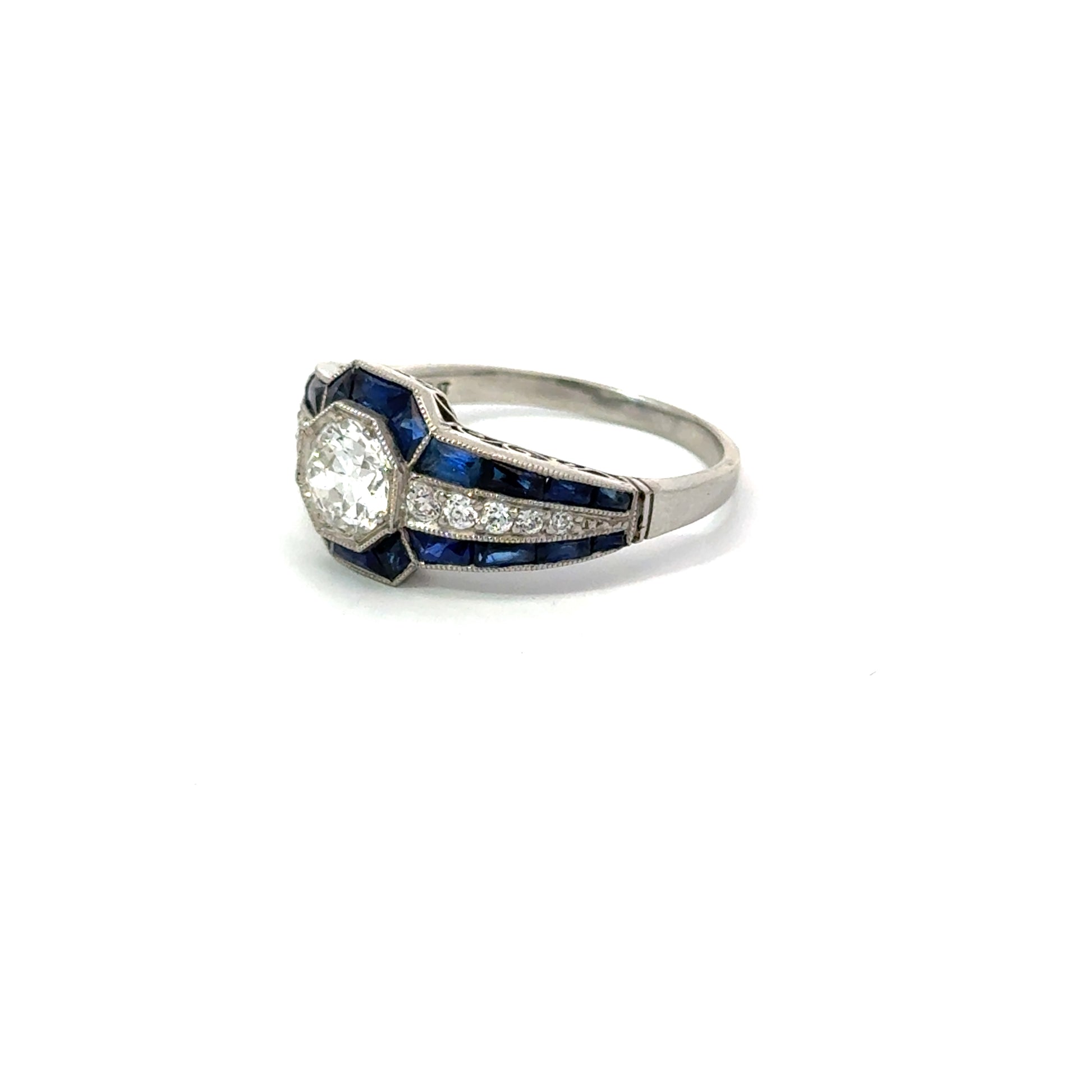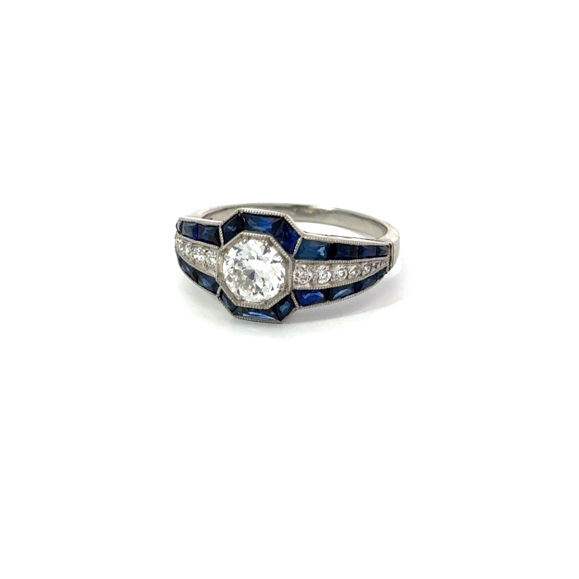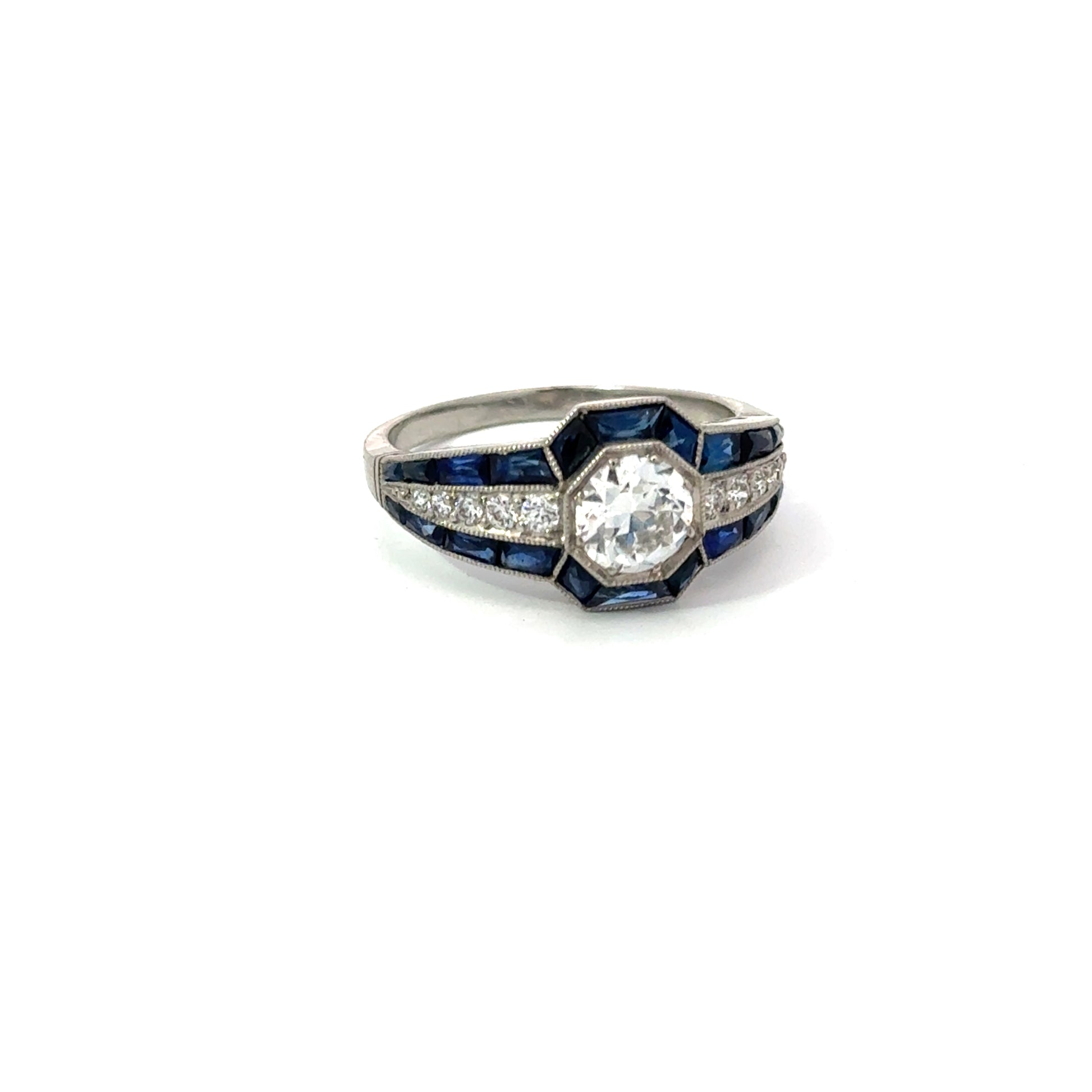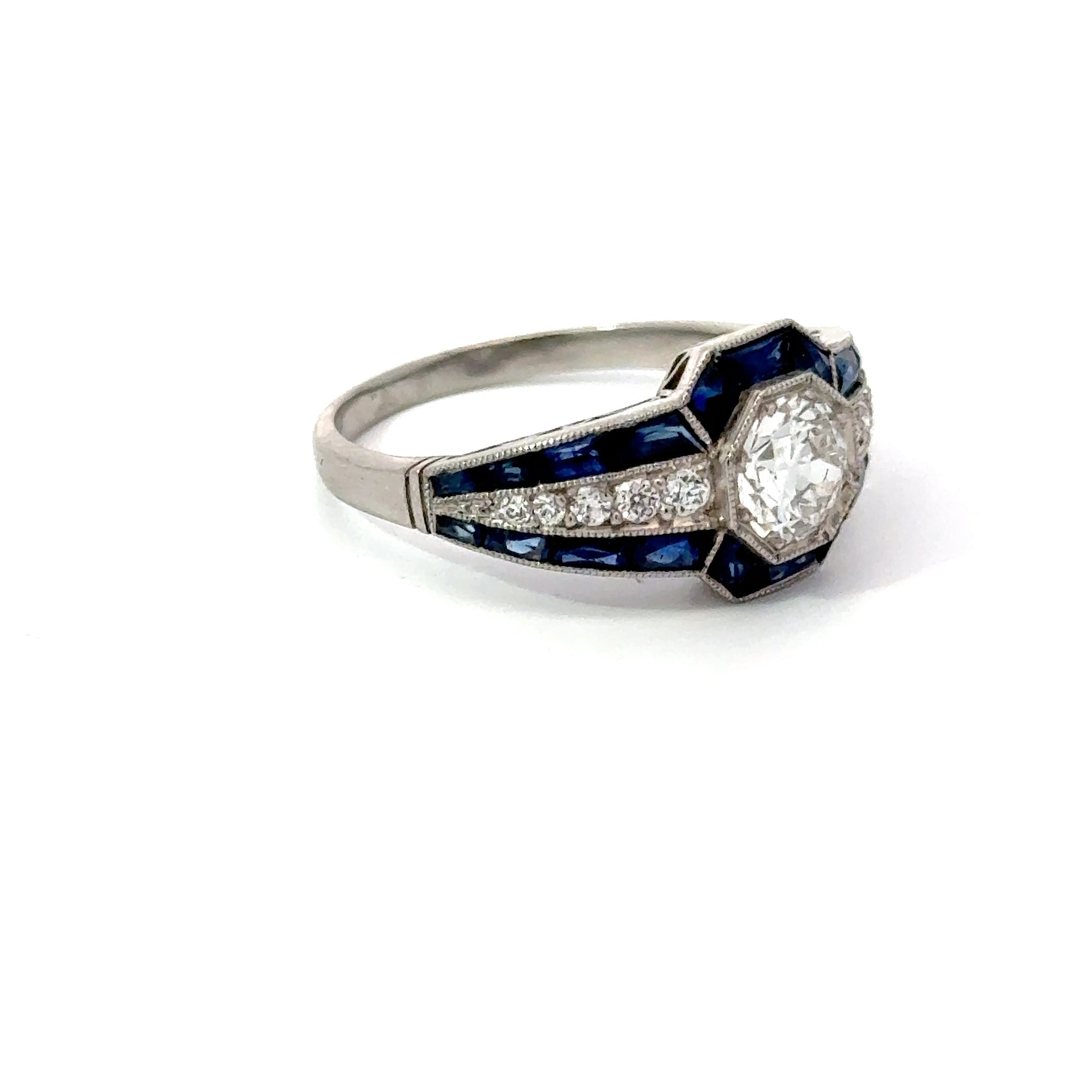 Stunning platinum estate ring with diamond center and sapphire accents. Expertly sourced and authenticated for condition and craftsmanship. Get yours now!