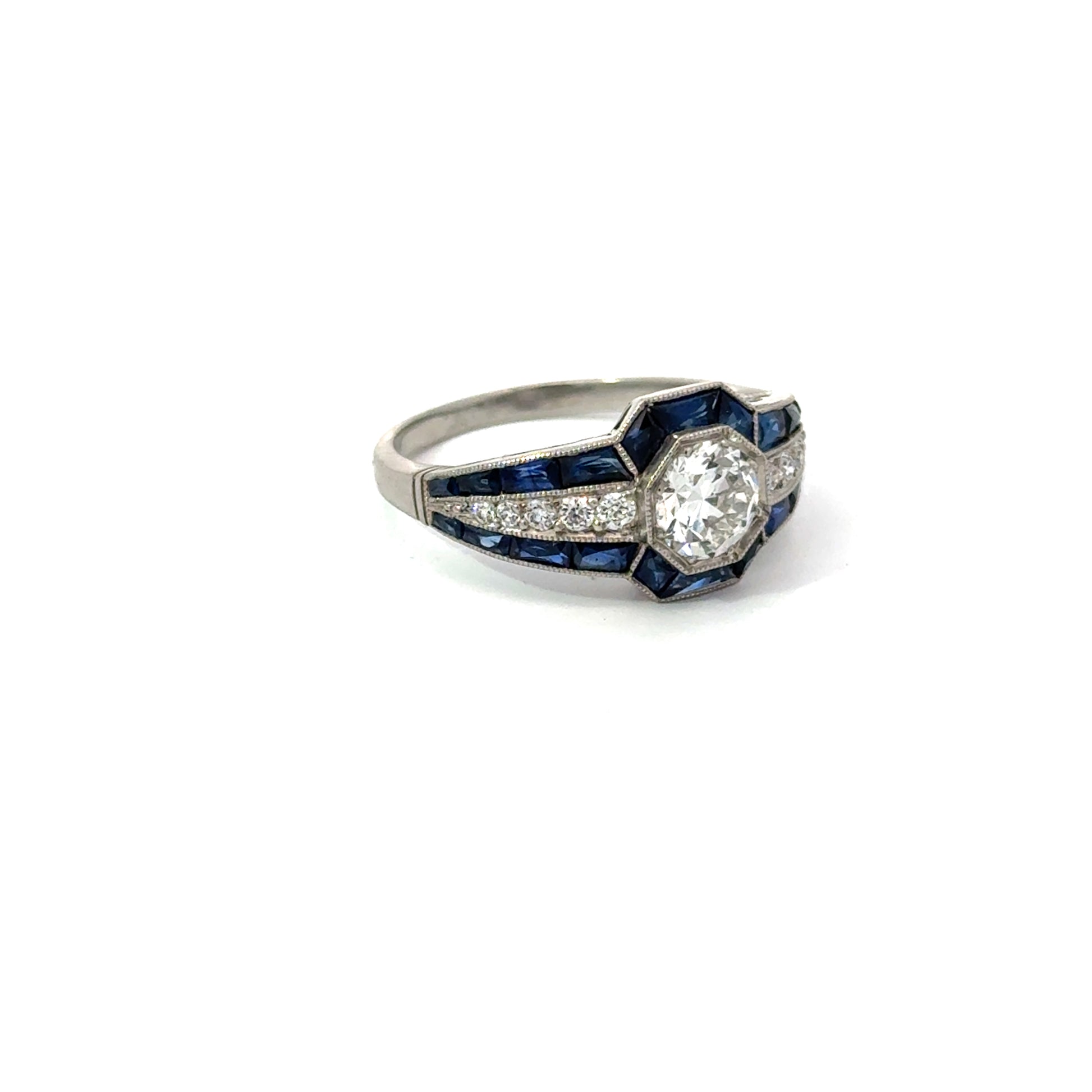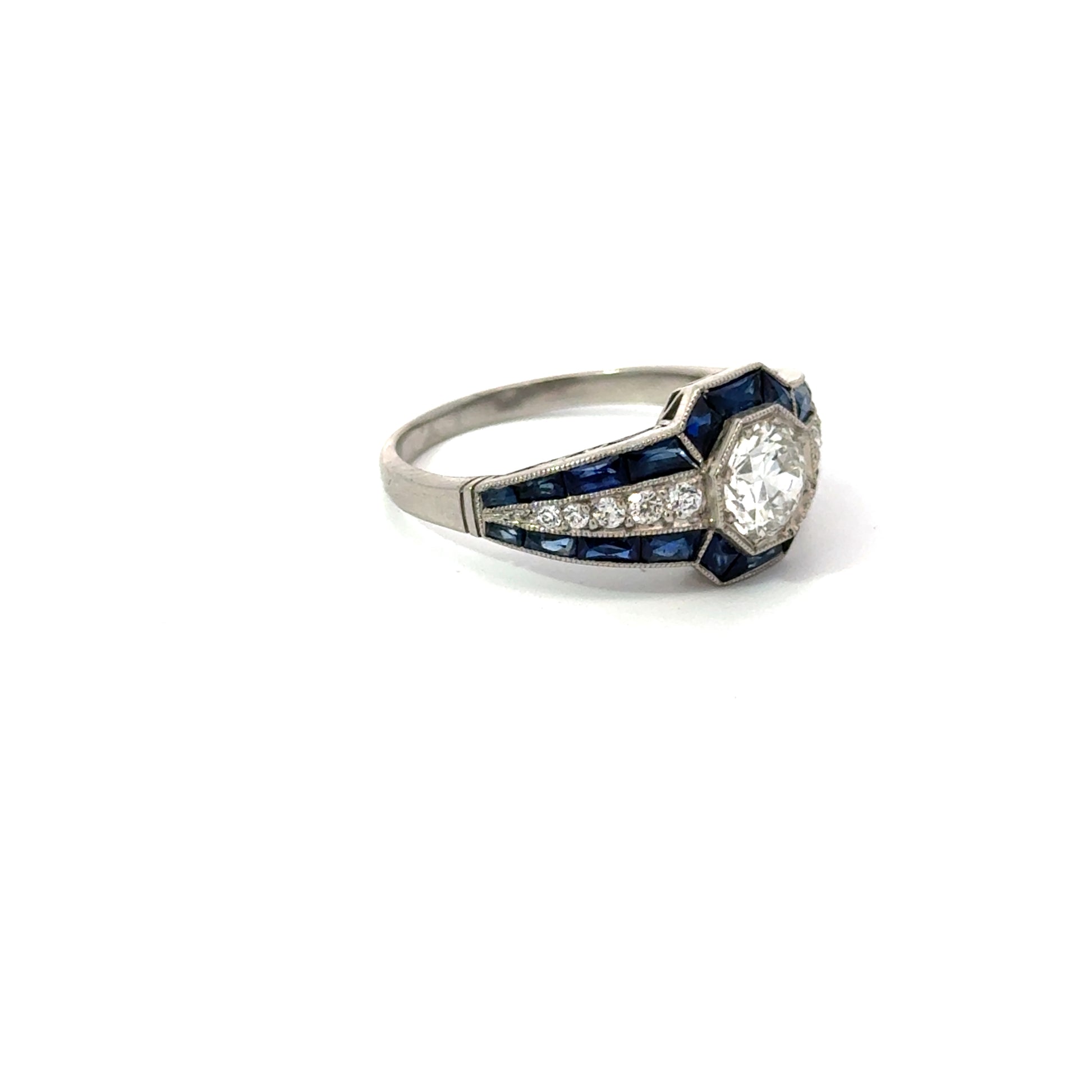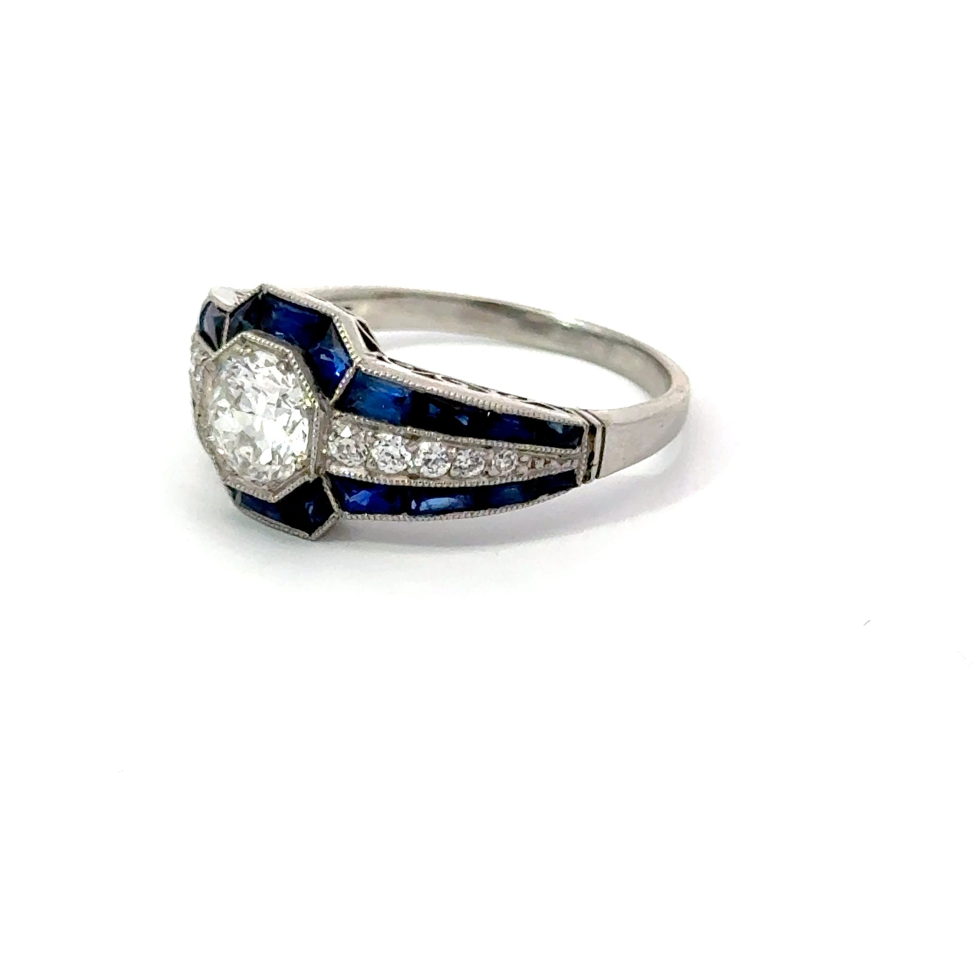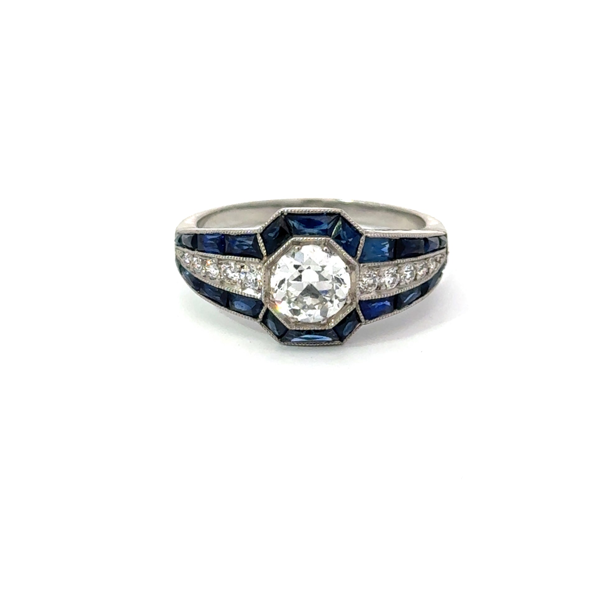 Stunning platinum estate ring with diamond center and sapphire accents. Expertly sourced and authenticated for condition and craftsmanship. Get yours now!