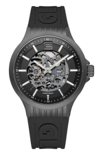 This timepiece showcases a sandblasted stainless steel case in gunmetal. Its skeletonized dial takes center stage, adorned with hands and indices featuring Swiss Super-LumiNova®. The appealing design is accentuated by a sporty black silicone strap with GLOCK lettering. Driven by an automatic movement and rated to 10 ATM water resistance, this watch guarantees consistent accuracy and reliability.