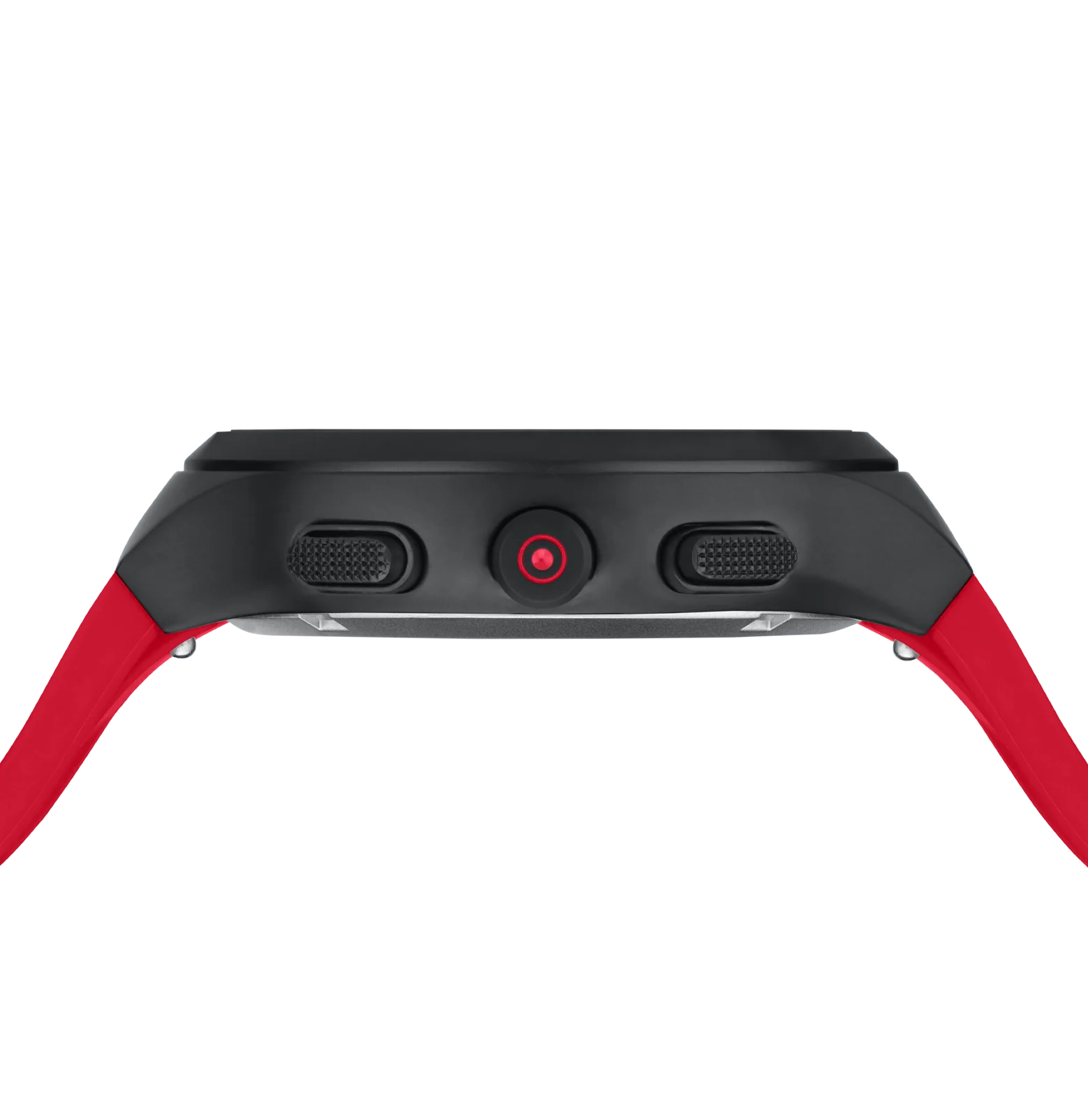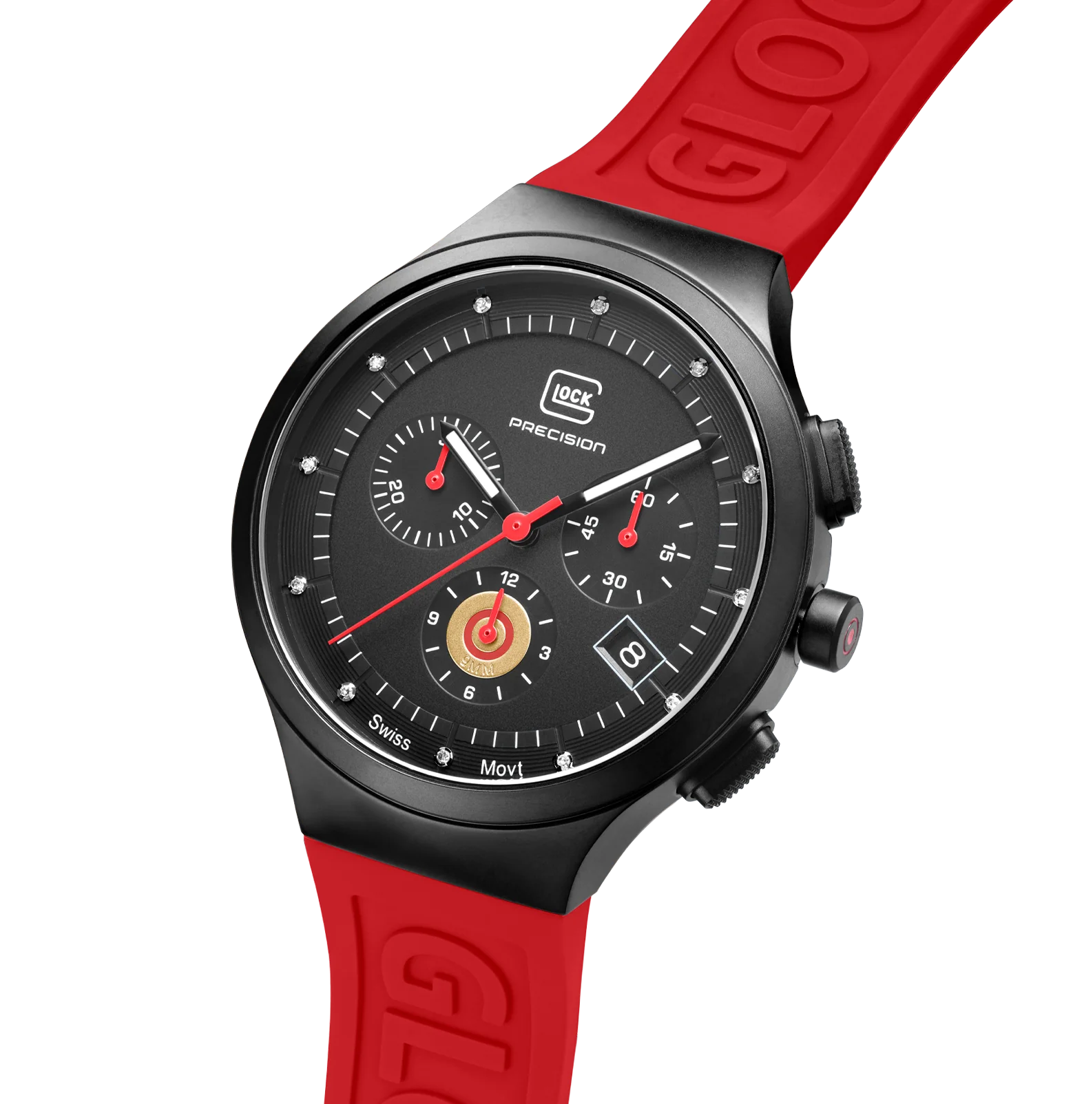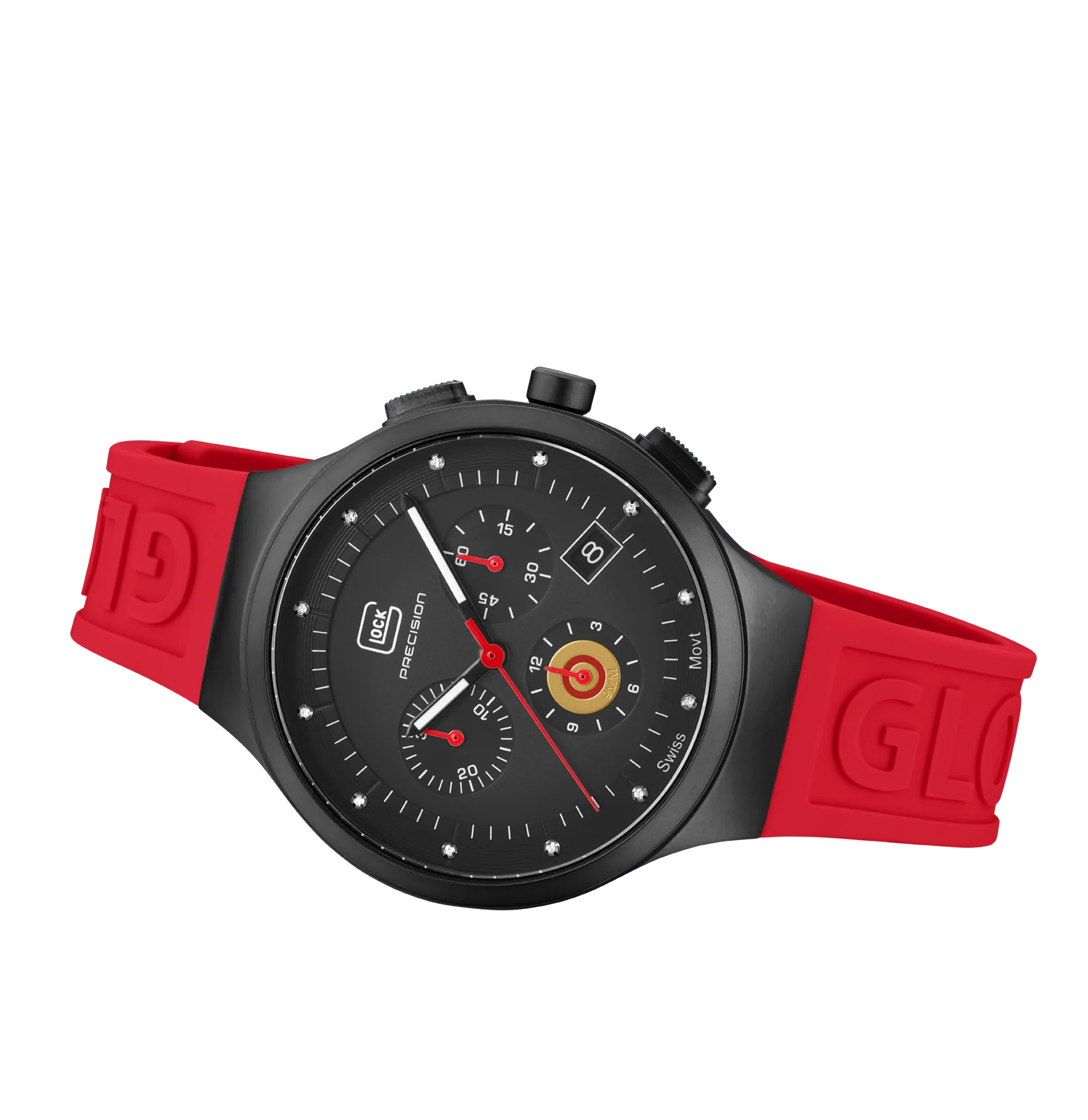 Elegant design combined with technical features. Framed in black sandblasted stainless steel, the diamond-studded black dial gives the watch an elegant appearance. Hands with Swiss Super-LumiNova® ensure clear readability, while the red silicone strap adds a striking accent. Driven by a Swiss movement, this watch features a chronograph function and a 10 ATM water-resistance rating, presenting high-quality design without compromising on technology.