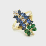 This is the first piece of our new collection. The Bluebonnet Ring. We chose Tsavorite Garnets at the bottom (pear-shaped) to give the real leafy look. The sapphires (marquise and round) are two different colors to give the piece more depth. The diamonds finalize this piece and help bring it to life. The Marquise shaped Sapphires are a lighter color than the round Sapphires and all of them are extremely well-cut. We have taken the time to sift through parcels of Sapphire to get the perfect ones for each piece.